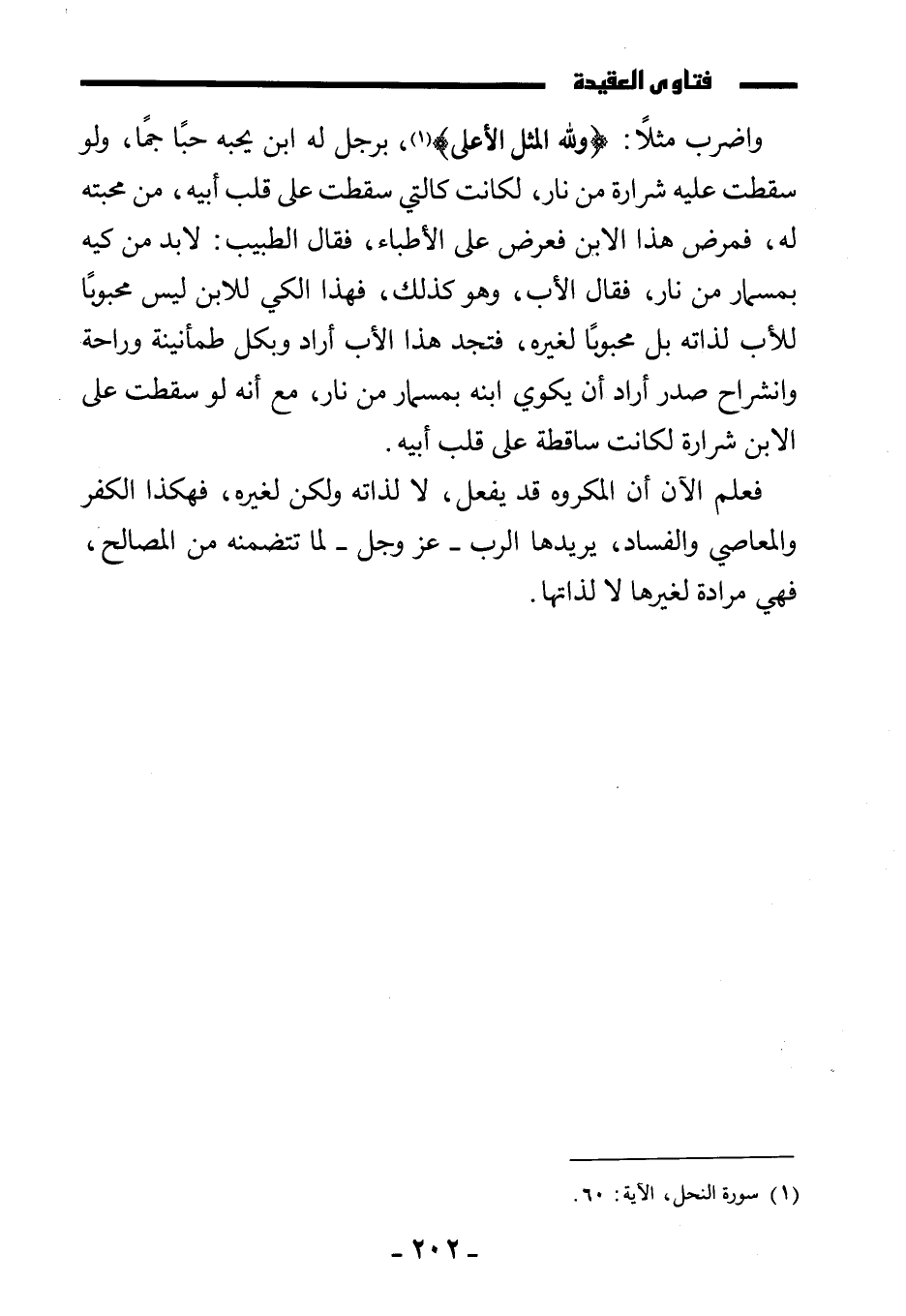 واضرب مثلا: {وَلِلَّهِ الْمَثَلُ الْأَعْلَى} ، برجل له ابن يحبه حبا جما، ولو سقطت عليه شرارة من نار، لكانت كالتي سقطت على قلب أبيه، من محبته له، فمرض هذا الابن فعرض على الأطباء، فقال الطبيب: لا بد من كيه بمسمار من نار، فقال الأب: وهو كذلك، فهذا الكي للابن ليس محبوبا للأب لذاته بل محبوبا لغيره، فتجد هذا الأب أراد وبكل طمأنينة وراحة وانشراح صدر أراد أن يكوي ابنه بمسمار من نار، مع أنه لو سقطت على الابن شرارة لكانت ساقطة على قلب أبيه.