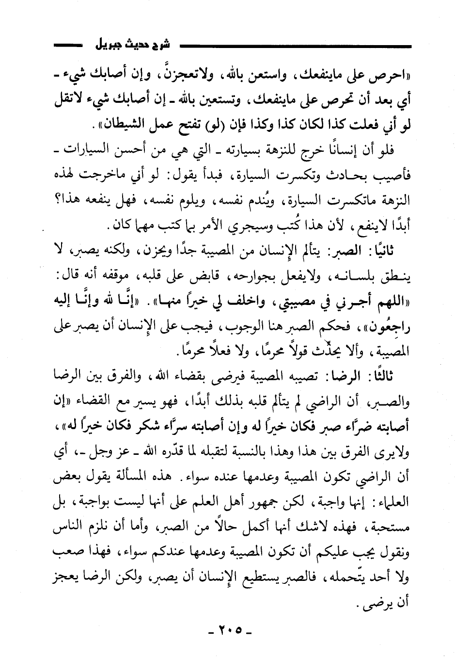 ثالثا: الرضا: تصيبه المصيبة فيرضى بقضاء الله، والفرق بين الرضا والصبر، أن الراضي لم يتألم قلبه بذلك أبدا، فهو يسير مع القضاء «إن إصابته ضراء صبر فكان خيرا له وإن أصابته سراء شكر فكان خيرا له» ، ولا يرى الفرق بين هذا وهذا بالنسبة لتقبله لما قدره الله - عز وجل -، أي إن الراضي تكون المصيبة وعدمها عنده سواء. هذه المسألة يقول بعض العلماء: إنها واجبة، لكن جمهور أهل العلم على أنها ليست بواجبة، بل مستحبة، فهذه لا شك أنها أكمل حالا من الصبر، وأما أن نلزم الناس ونقول: يجب عليكم أن تكون المصيبة وعدمها عندكم سواء، فهذا صعب ولا أحد يتحمله، فالصبر يستطيع الإنسان أن يصبر، ولكن الرضا يعجز أن يرضى.