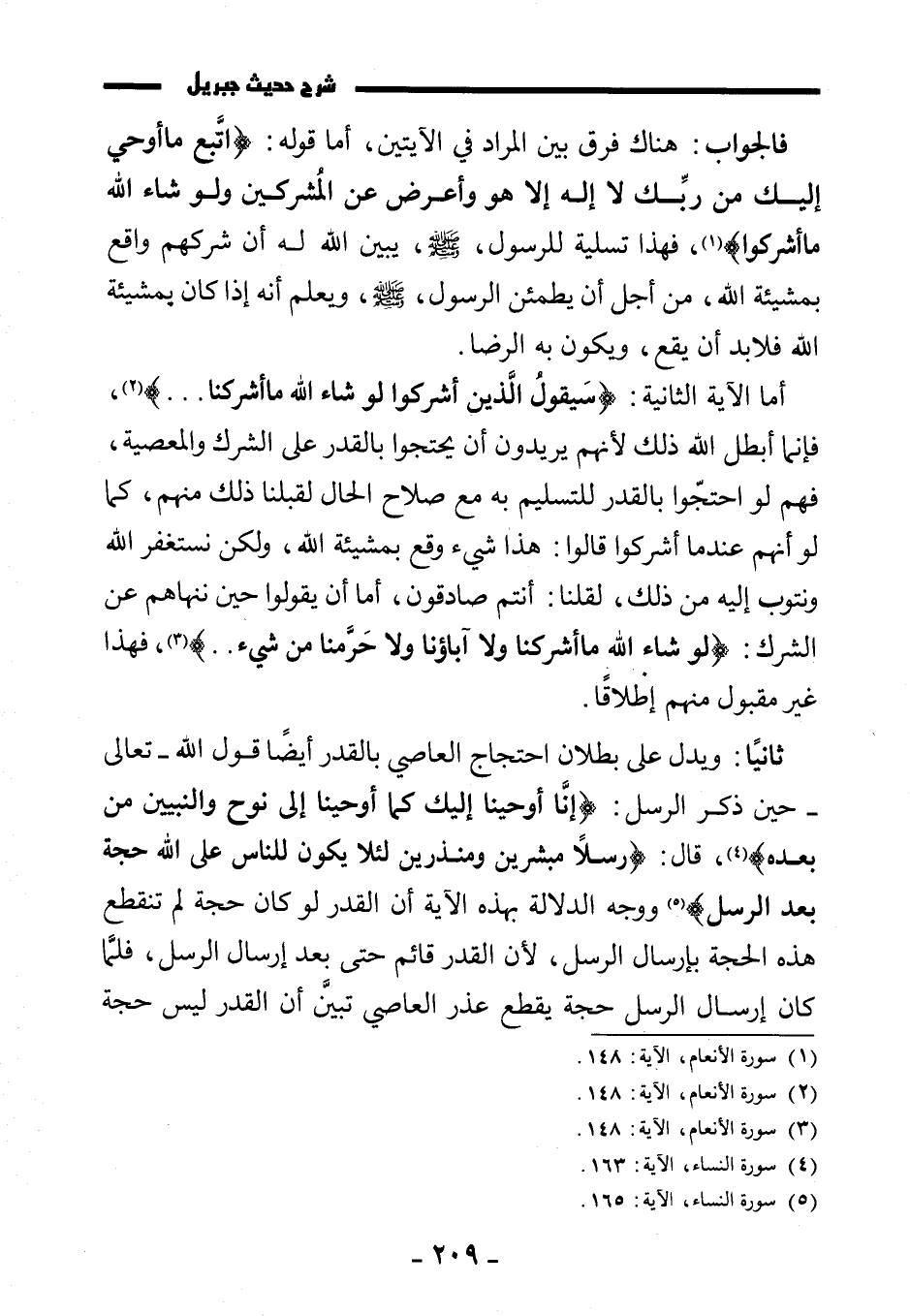 ثانيا: ويدل على بطلان احتجاج العاصي بالقدر أيضا قول الله تعالى حين ذكر الرسل: {إِنَّا أَوْحَيْنَا إِلَيْكَ كَمَا أَوْحَيْنَا إِلَى نُوحٍ وَالنَّبِيِّينَ مِنْ بَعْدِهِ} ، قال: {رُسُلًا مُبَشِّرِينَ وَمُنْذِرِينَ لِئَلَّا يَكُونَ لِلنَّاسِ عَلَى اللَّهِ حُجَّةٌ بَعْدَ الرُّسُلِ} . ووجه الدلالة بهذه الآية أن القدر لو كان حجة لم تنقطع هذه الحجة بإرسال الرسل؛ لأن القدر قائم حتى بعد إرسال الرسل، فلما كان إرسال الرسل حجة تقطع عذر العاصي تبين أن القدر ليس حجة