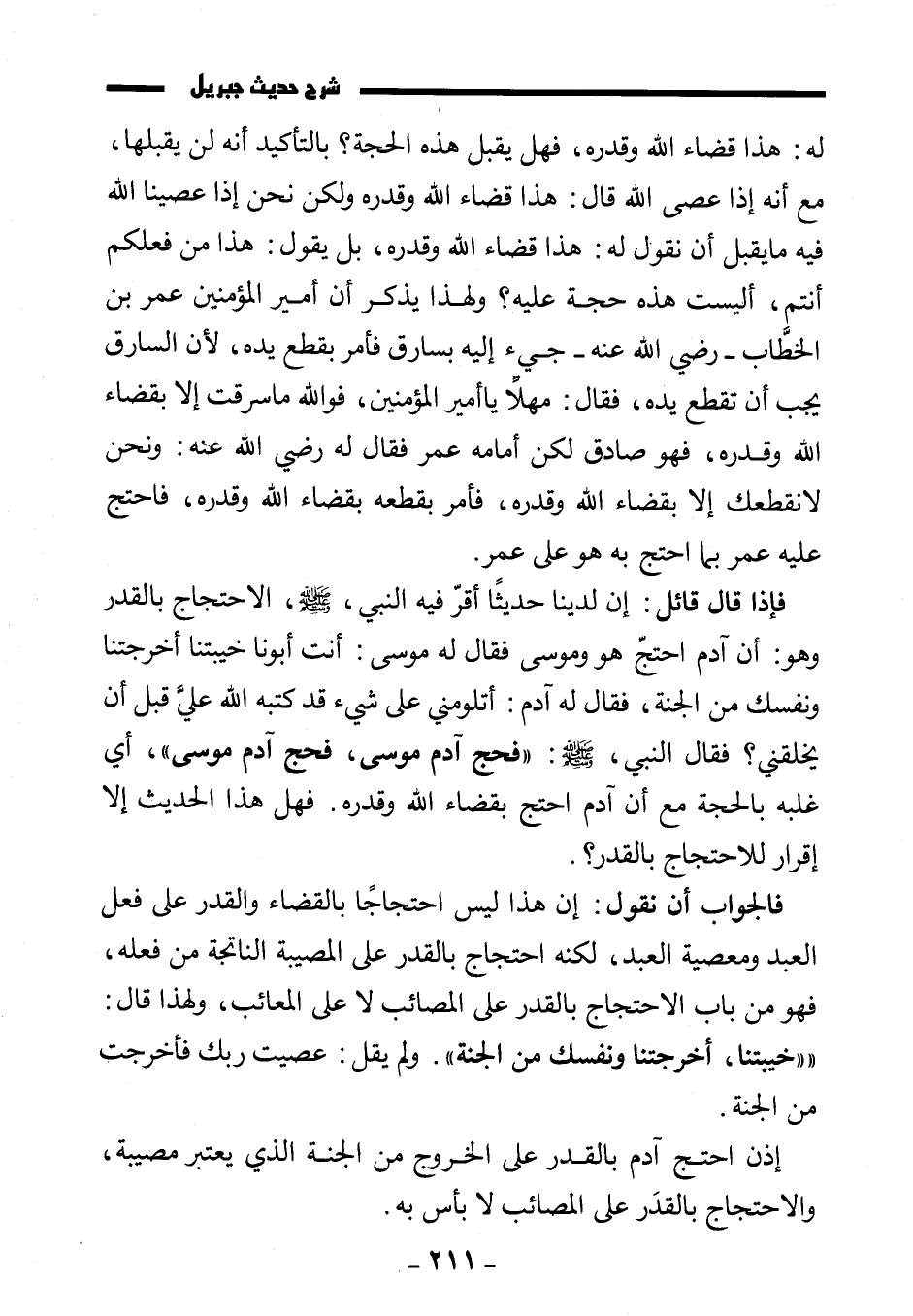فإذا قال قائل: إن لدينا حديثا أقر فيه النبي، صَلَّى اللَّهُ عَلَيْهِ وَسَلَّمَ، الاحتجاج بالقدر وهو: «أن آدم احتج هو وموسى فقال له موسى: أنت أبونا خيبتنا أخرجتنا ونفسك من الجنة، فقال له آدم: أتلومني على شيء قد كتبه الله علي قبل أن يخلقني؟ فقال النبي، صَلَّى اللَّهُ عَلَيْهِ وَسَلَّمَ: " فحج آدم موسى، فحج آدم موسى» ، أي غلبه بالحجة مع أن آدم احتج بقضاء الله وقدره. فهل هذا الحديث إلا إقرار للاحتجاج بالقدر؟
