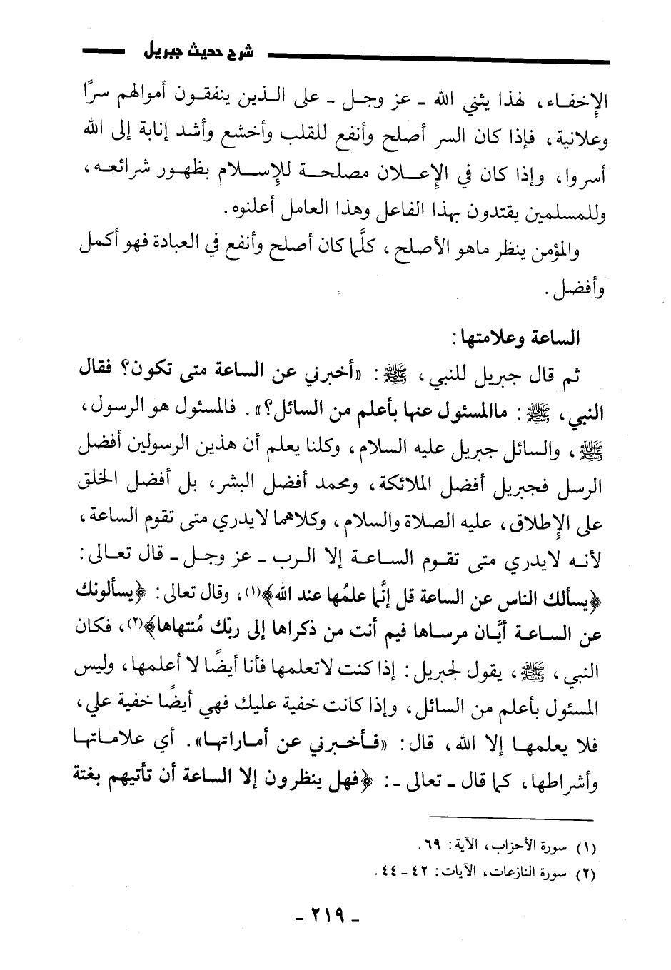 ثم قال جبريل للنبي، صَلَّى اللَّهُ عَلَيْهِ وَسَلَّمَ: «أخبرني عن الساعة متى تكون؟ فقال النبي، صَلَّى اللَّهُ عَلَيْهِ وَسَلَّمَ: ما المسؤول عنها بأعلم من السائل؟» فالمسؤول هو الرسول، صَلَّى اللَّهُ عَلَيْهِ وَسَلَّمَ، والسائل جبريل عليه السلام، وكلنا يعلم أن هذين الرسولين أفضل الرسل فجبريل أفضل الملائكة، ومحمد أفضل البشر، بل أفضل الخلق على الإطلاق، عليه الصلاة والسلام، وكلاهما لا يدري متى تقوم الساعة؛ لأنه لا يدري متى تقوم الساعة إلا الرب - عز وجل - قال تعالى: {يَسْأَلُكَ النَّاسُ عَنِ السَّاعَةِ قُلْ إِنَّمَا عِلْمُهَا عِنْدَ اللَّهِ} ، وقال تعالى: {يَسْأَلُونَكَ عَنِ السَّاعَةِ أَيَّانَ مُرْسَاهَا فِيمَ أَنْتَ مِنْ ذِكْرَاهَا إِلَى رَبِّكَ مُنْتَهَاهَا} ، فكان النبين صَلَّى اللَّهُ عَلَيْهِ وَسَلَّمَ، يقول لجبريل: إذا كنت لا تعلمها فأنا أيضا لا أعلمها، وليس المسؤول بأعلم من السائل، وإذا كانت خفية عليك فهي أيضا خفية علي، فلا يعلمها إلا الله، قال: «فأخبرني عن أماراتها» . أي علاماتها وأشراطها، كما قال تعالى: {فَهَلْ يَنْظُرُونَ إِلَّا السَّاعَةَ أَنْ تَأْتِيَهُمْ بَغْتَةً فَقَدْ جَاءَ أَشْرَاطُهَا} .