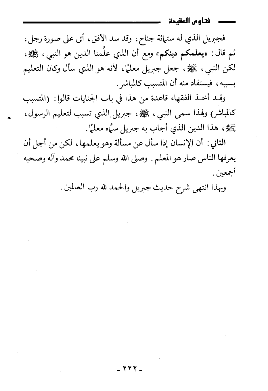 وقد أخذ الفقهاء قاعدة من هذا في باب الجنايات قالوا: (المتسبب كالمباشر) ولهذا سمى النبي، صَلَّى اللَّهُ عَلَيْهِ وَسَلَّمَ، جبريل الذي تسبب لتعليم الرسول، صَلَّى اللَّهُ عَلَيْهِ وَسَلَّمَ، هذا الدين الذي أجاب به جبريل سماه معلما.