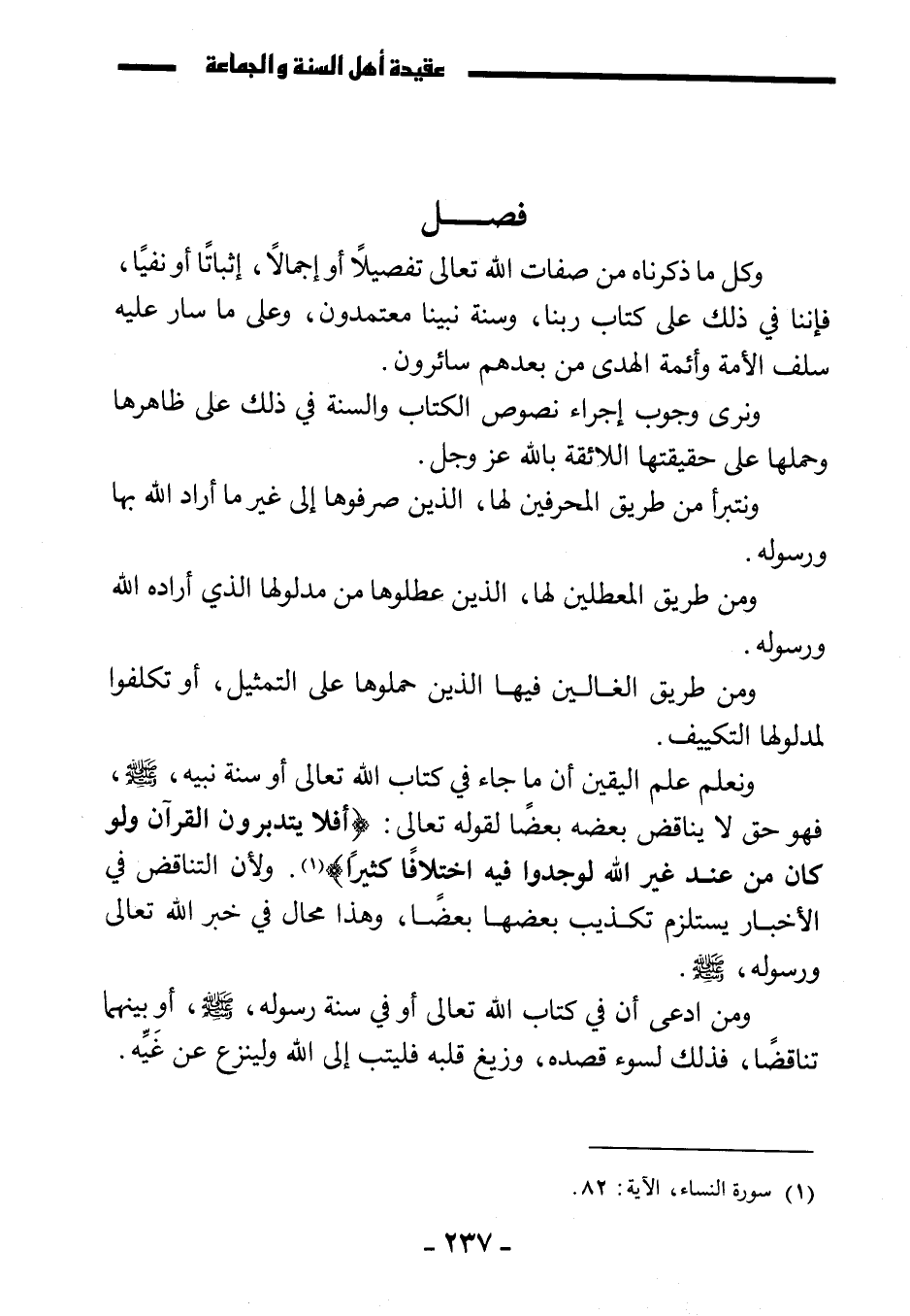ونرى وجوب إجراء نصوص الكتاب والسنة في ذلك على ظاهرها وحملها على حقيقتها اللائقة بالله عز وجل.
