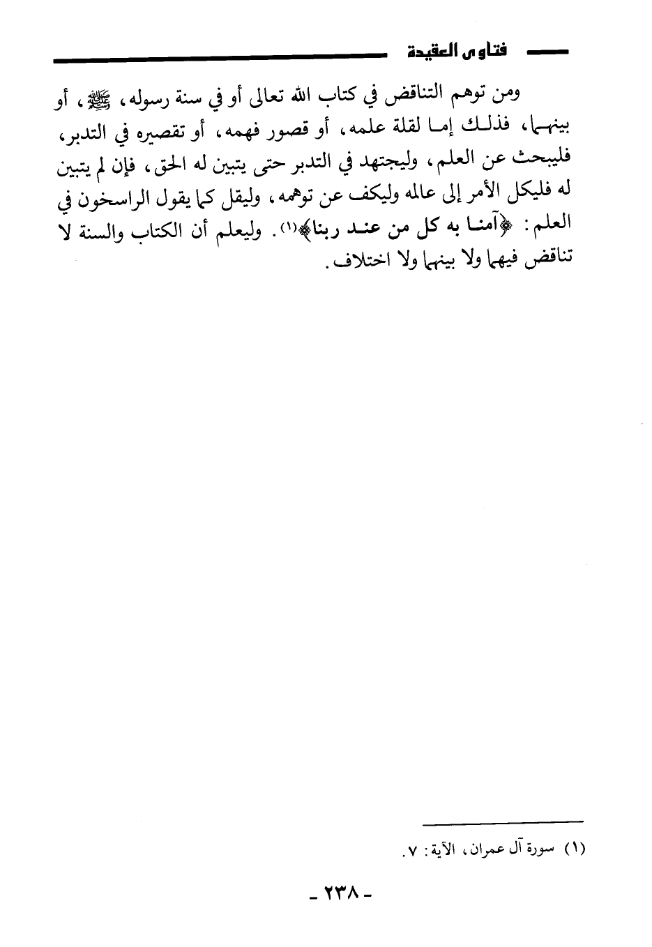 ومن توهم التناقض في كتاب الله تعالى أو في سنة رسوله، صَلَّى اللَّهُ عَلَيْهِ وَسَلَّمَ، أو بينهما، فذلك إما لقلة علمه، أو قصور فهمه، أو تقصيره في التدبر، فليبحث عن العلم، وليجتهد في التدبر حتى يتبين له الحق، فإن لم يتبين له فليكل الأمر إلى عالمه وليكف عن توهمه، وليقل كما يقول الراسخون في العلم: {آمَنَّا بِهِ كُلٌّ مِنْ عِنْدِ رَبِّنَا} . وليعلم أن الكتاب والسنة لا تناقض فيهما ولا بينهما ولا اختلاف.