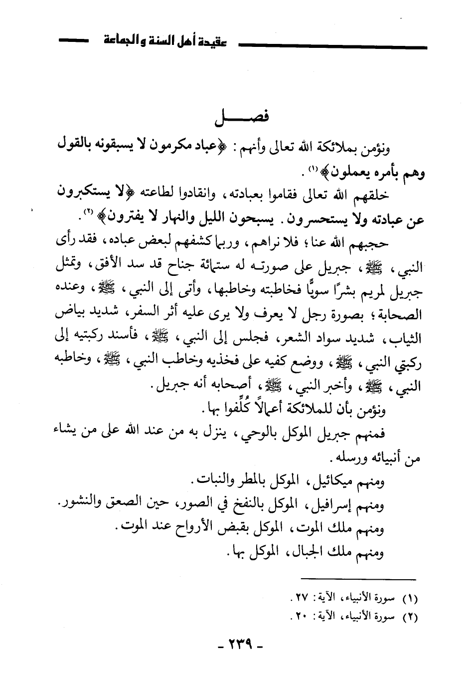 ونؤمن بملائكة الله تعالى وأنهم: {عِبَادٌ مُكْرَمُونَ لَا يَسْبِقُونَهُ بِالْقَوْلِ وَهُمْ بِأَمْرِهِ يَعْمَلُونَ} . خلقهم الله تعالى فقاموا بعبادته، وانقادوا لطاعته {لَا يَسْتَكْبِرُونَ عَنْ عِبَادَتِهِ وَلَا يَسْتَحْسِرُونَ يُسَبِّحُونَ اللَّيْلَ وَالنَّهَارَ لَا يَفْتُرُونَ} .