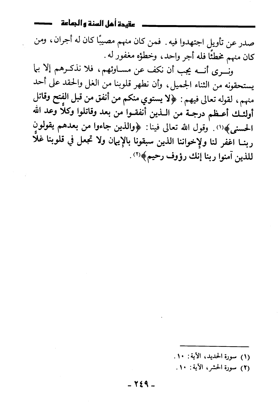ونرى أنه يجب أن نكف عن مساوئهم، فلا نذكرهم إلا بما يستحقونه من الثناء الجميل، وأن نطهر قلوبنا من الغل والحقد على أحد منهم، لقوله تعالى فيهم: {لَا يَسْتَوِي مِنْكُمْ مَنْ أَنْفَقَ مِنْ قَبْلِ الْفَتْحِ وَقَاتَلَ أُولَئِكَ أَعْظَمُ دَرَجَةً مِنَ الَّذِينَ أَنْفَقُوا مِنْ بَعْدُ وَقَاتَلُوا وَكُلًّا وَعَدَ اللَّهُ الْحُسْنَى} . وقول الله تعالى فينا: {وَالَّذِينَ جَاءُوا مِنْ بَعْدِهِمْ يَقُولُونَ رَبَّنَا اغْفِرْ لَنَا وَلِإِخْوَانِنَا الَّذِينَ سَبَقُونَا بِالْإِيمَانِ وَلَا تَجْعَلْ فِي قُلُوبِنَا غِلًّا لِلَّذِينَ آمَنُوا رَبَّنَا إِنَّكَ رَءُوفٌ رَحِيمٌ} .