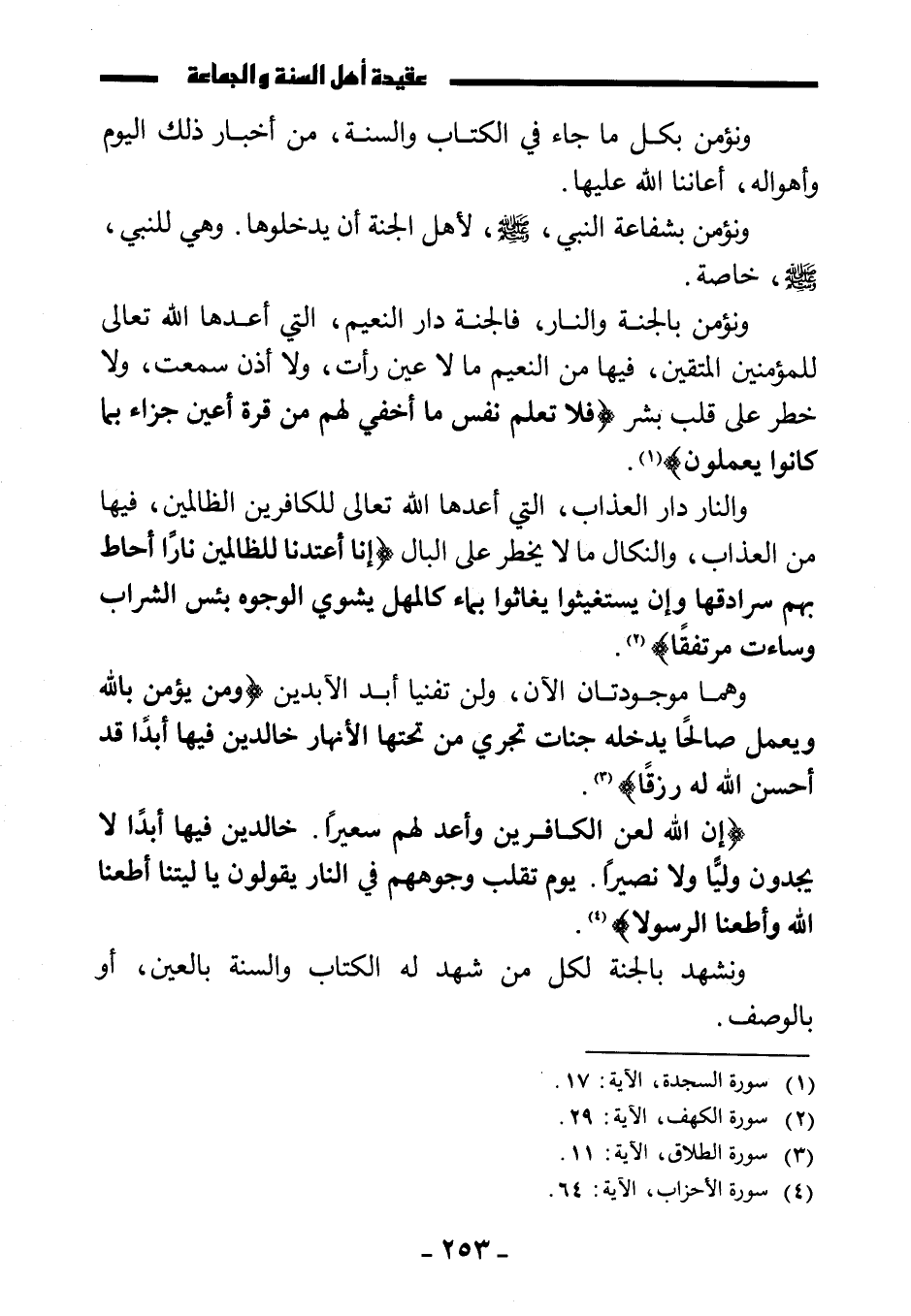 ونؤمن بالجنة والنار، فالجنة دار النعيم، التي أعدها الله تعالى للمؤمنين المتقين، فيها من النعيم ما لا عين رأت، ولا أذن سمعت، ولا خطر على قلب بشر {فَلَا تَعْلَمُ نَفْسٌ مَا أُخْفِيَ لَهُمْ مِنْ قُرَّةِ أَعْيُنٍ جَزَاءً بِمَا كَانُوا يَعْمَلُونَ} .