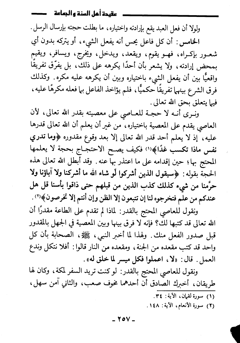 ونرى أنه لا حجة للعاصي على معصيته بقدر الله تعالى؛ لأن العاصي يقدم على المعصية باختياره، من غير أن يعلم أن الله تعالى قدرها عليه، إذ لا يعلم أحد قدر الله تعالى إلا بعد وقوع مقدوره {وَمَا تَدْرِي نَفْسٌ مَاذَا تَكْسِبُ غَدًا} فكيف يصح الاحتجاج بحجة لا يعلمها المحتج بها، حين إقدامه على ما اعتذر بها عنه. وقد أبطل الله تعالى هذه الحجة بقوله: {سَيَقُولُ الَّذِينَ أَشْرَكُوا لَوْ شَاءَ اللَّهُ مَا أَشْرَكْنَا وَلَا آبَاؤُنَا وَلَا حَرَّمْنَا مِنْ شَيْءٍ كَذَلِكَ كَذَّبَ الَّذِينَ مِنْ قَبْلِهِمْ حَتَّى ذَاقُوا بَأْسَنَا قُلْ هَلْ عِنْدَكُمْ مِنْ عِلْمٍ فَتُخْرِجُوهُ لَنَا إِنْ تَتَّبِعُونَ إِلَّا الظَّنَّ وَإِنْ أَنْتُمْ إِلَّا تَخْرُصُونَ} .