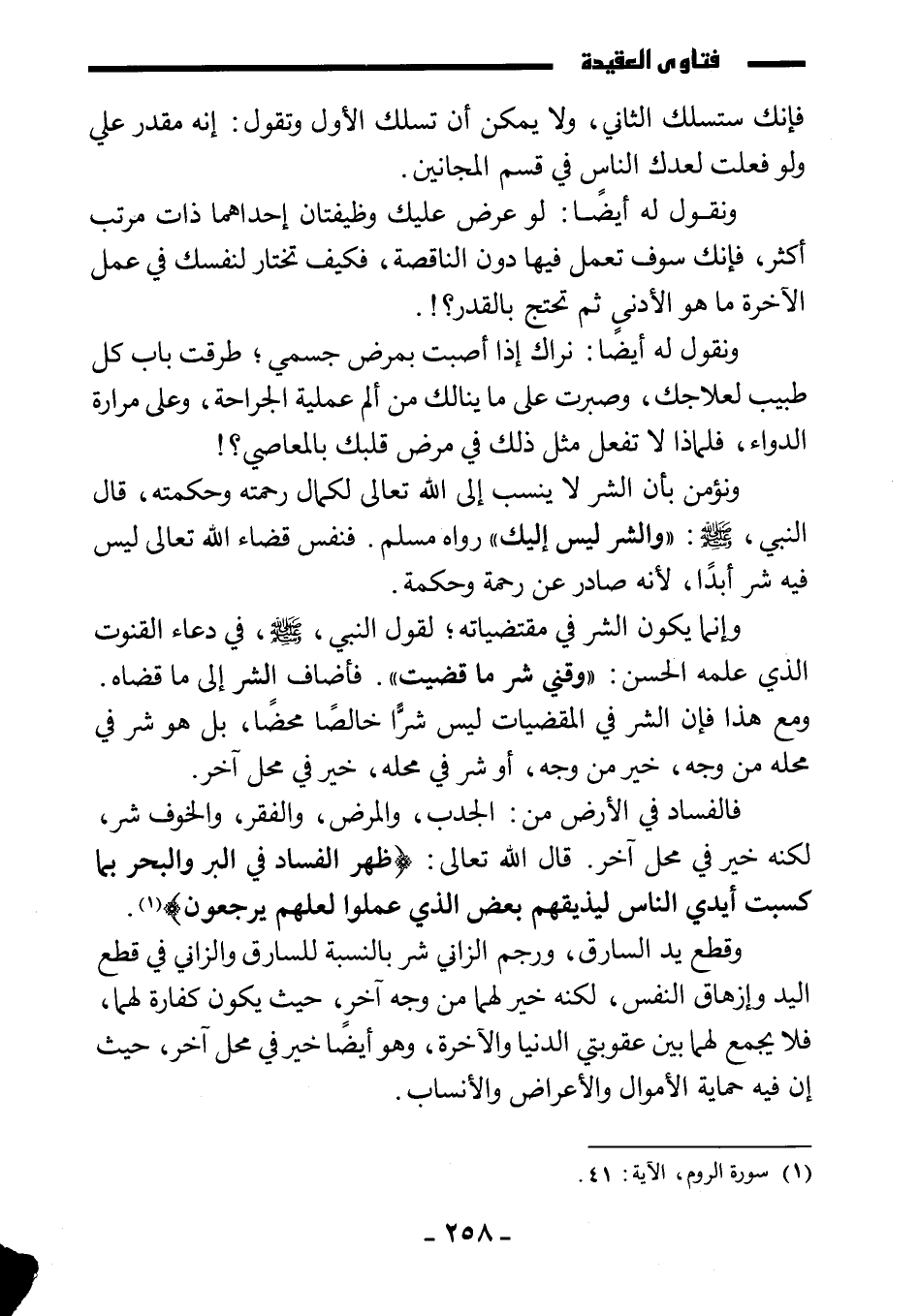 وإنما يكون الشر في مقتضياته؛ لقول النبي، صَلَّى اللَّهُ عَلَيْهِ وَسَلَّمَ، في دعاء القنوت الذي علمه الحسن: «وقني شر ما قضيت» . فأضاف الشر إلى ما قضاه. ومع هذا فإن الشر في المقضيات ليس شرا خالصا محضا، بل هو شر في محله من وجه، خير من وجه، أو شر في محله، خير في محل آخر.