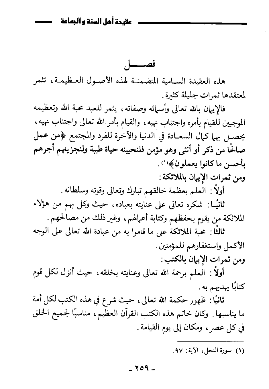 فالإيمان بالله تعالى وأسمائه وصفاته، يثمر للعبد محبة الله وتعظيمه الموجبين للقيام بأمره واجتناب نهيه، والقيام بأمر الله تعالى واجتناب نهيه، يحصل بهما كمال السعادة في الدنيا والآخرة للفرد والمجتمع {مَنْ عَمِلَ صَالِحًا مِنْ ذَكَرٍ أَوْ أُنْثَى وَهُوَ مُؤْمِنٌ فَلَنُحْيِيَنَّهُ حَيَاةً طَيِّبَةً وَلَنَجْزِيَنَّهُمْ أَجْرَهُمْ بِأَحْسَنِ مَا كَانُوا يَعْمَلُونَ} .