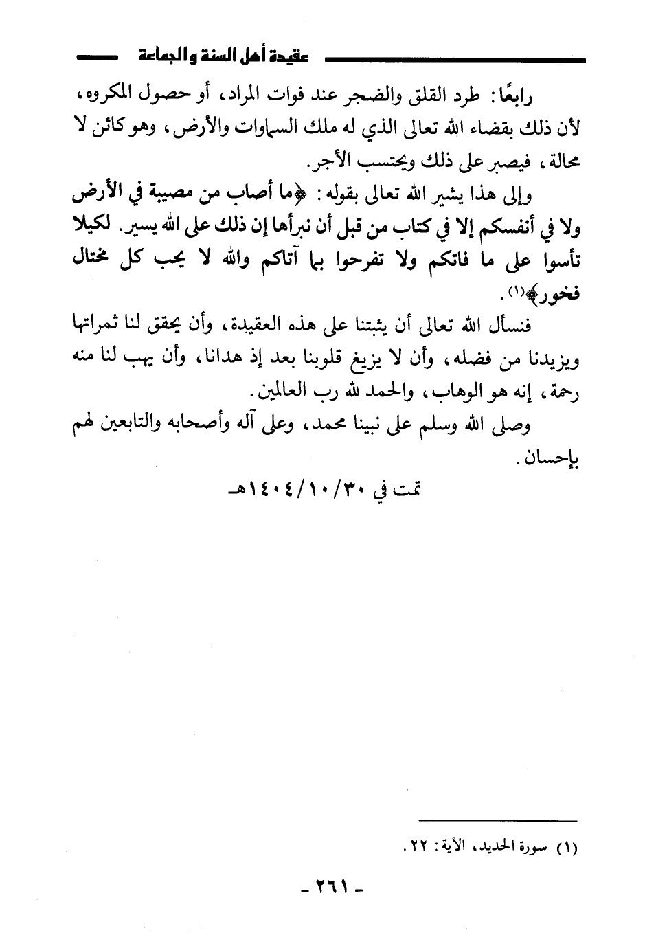 وإلى هذا يشير الله تعالى بقوله: {مَا أَصَابَ مِنْ مُصِيبَةٍ فِي الْأَرْضِ وَلَا فِي أَنْفُسِكُمْ إِلَّا فِي كِتَابٍ مِنْ قَبْلِ أَنْ نَبْرَأَهَا إِنَّ ذَلِكَ عَلَى اللَّهِ يَسِيرٌ لِكَيْ لَا تَأْسَوْا عَلَى مَا فَاتَكُمْ وَلَا تَفْرَحُوا بِمَا آتَاكُمْ وَاللَّهُ لَا يُحِبُّ كُلَّ مُخْتَالٍ فَخُورٍ} .