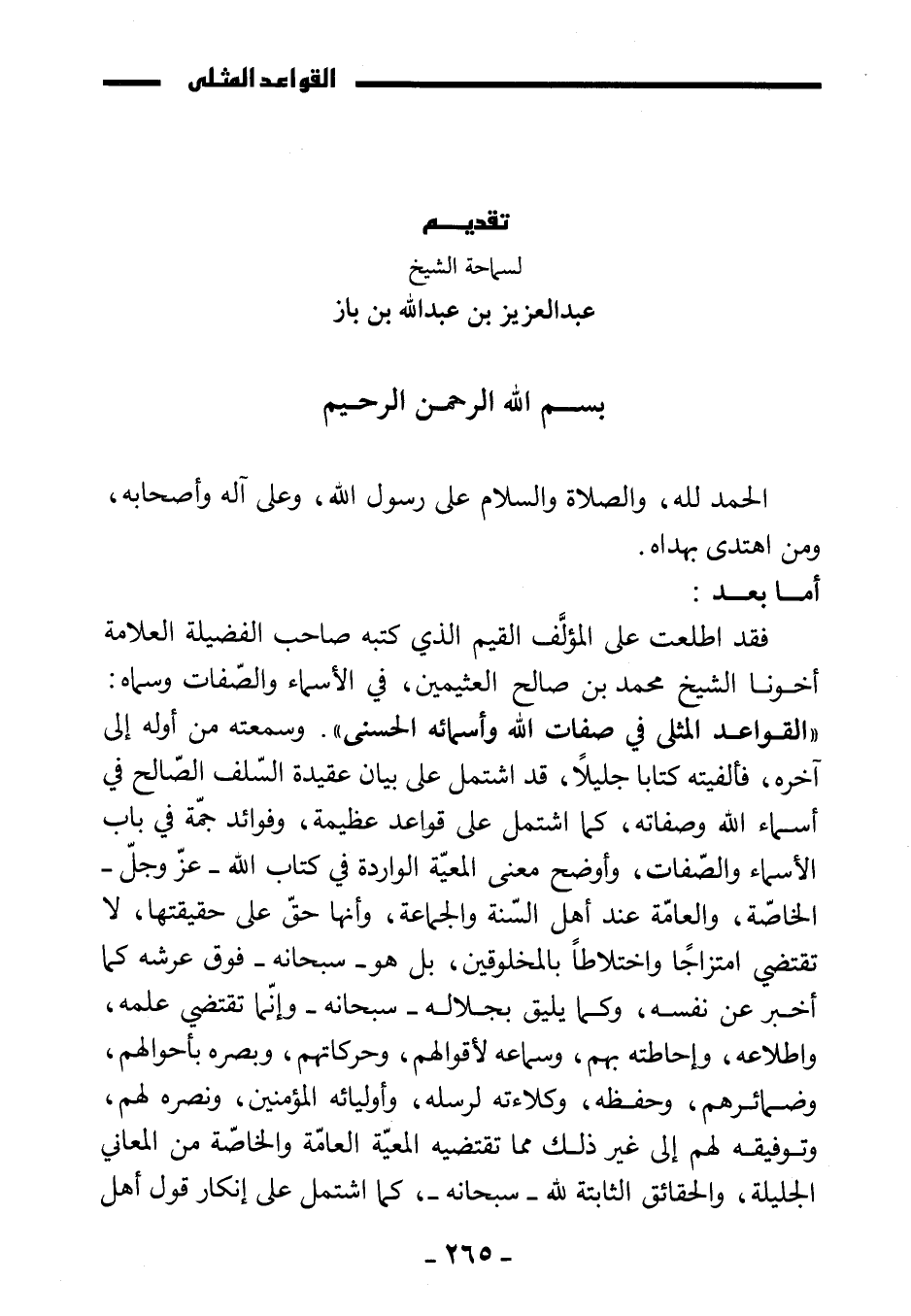 فقد اطلعت على المؤلف القيم الذي كتبه صاحب الفضيلة العلامة أخونا الشيخ محمد بن صالح العثيمين، في الأسماء والصفات وسماه: " القواعد المثلى في صفات الله وأسمائه الحسنى ". وسمعته من أوله إلى آخره، فألفيته كتابا جليلا، قد اشتمل على بيان عقيدة السلف الصالح في أسماء الله وصفاته، كما اشتمل على قواعد عظيمة، وفوائد جمة في باب الأسماء والصفات، وأوضح معنى المعية الواردة في كتاب الله - عز وجل - الخاصة، والعامة عند أهل السنة والجماعة، وأنها حق على حقيقتها، لا تقتضي امتزاجا واختلاطا بالمخلوقين، بل هو سبحانه فوق عرشه كما أخبر عن نفسه، وكما يليق بجلاله سبحانه وإنما تقتضي علمه، واطلاعه، وإحاطته بهم، وسماعه لأقوالهم، وحركاتهم، وبصره بأحوالهم، وضمائرهم، وحفظه، وكلاءته لرسله، وأوليائه المؤمنين، ونصره لهم، وتوفيقه لهم إلى غير ذلك مما تقتضيه المعية العامة والخاصة من المعاني الجليلة، والحقائق الثابتة لله - سبحانه -، كما اشتمل على إنكار قول أهل
