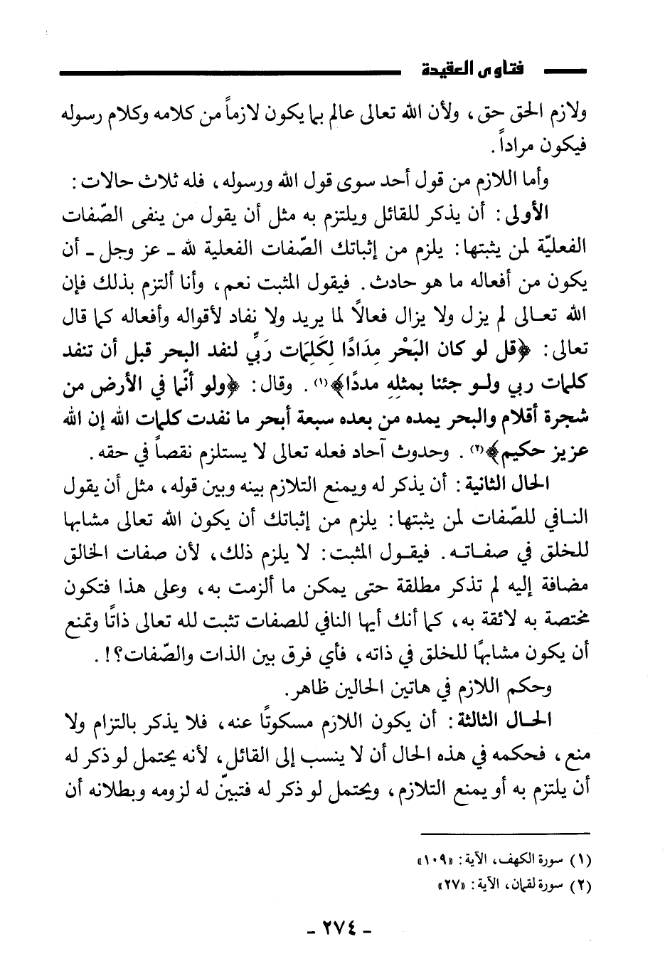 الأولى: أن يذكر للقائل ويلتزم به مثل أن يقول من ينفي الصفات الفعلية لمن يثبتها: يلزم من إثباتك الصفات الفعلية لله - عز وجل - أن يكون من أفعاله ما هو حادث. فيقول المثبت: نعم، وأنا ألتزم بذلك فإن الله تعالى لم يزل ولا يزال فعالا لما يريد ولا نفاد لأقواله وأفعاله كما قال تعالى: {قُلْ لَوْ كَانَ الْبَحْرُ مِدَادًا لِكَلِمَاتِ رَبِّي لَنَفِدَ الْبَحْرُ قَبْلَ أَنْ تَنْفَدَ كَلِمَاتُ رَبِّي وَلَوْ جِئْنَا بِمِثْلِهِ مَدَدًا} . وقال: {وَلَوْ أَنَّمَا فِي الْأَرْضِ مِنْ شَجَرَةٍ أَقْلَامٌ وَالْبَحْرُ يَمُدُّهُ مِنْ بَعْدِهِ سَبْعَةُ أَبْحُرٍ مَا نَفِدَتْ كَلِمَاتُ اللَّهِ إِنَّ اللَّهَ عَزِيزٌ حَكِيمٌ} . وحدوث آحاد فعله تعالى لا يستلزم نقصا في حقه.