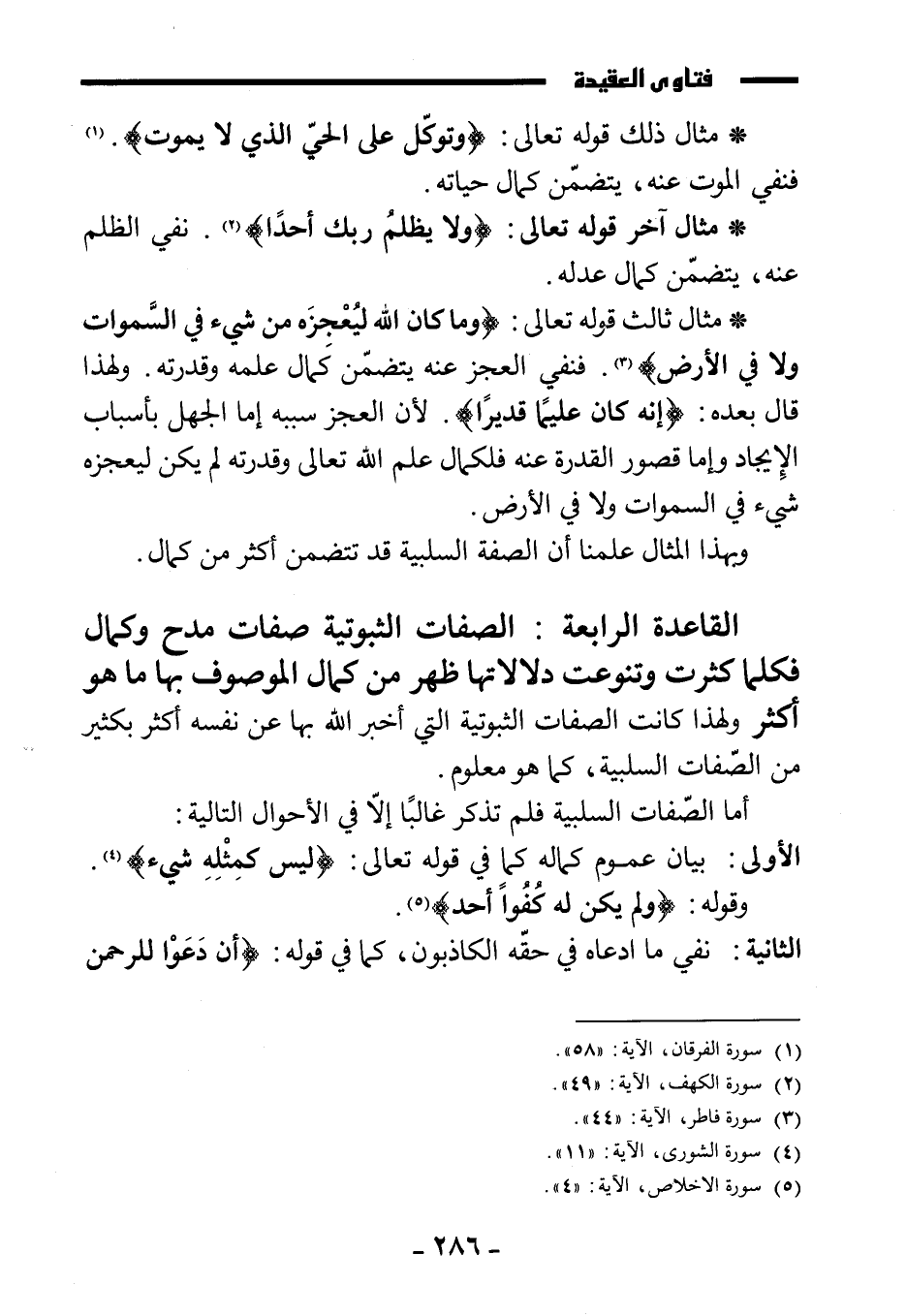 القاعدة الرابعة: الصفات الثبوتية صفات مدح وكمال فكلما كثرت وتنوعت دلالاتها ظهر من كمال الموصوف بها ما هو أكثر ولهذا كانت الصفات الثبوتية التي أخبر الله بها عن نفسه أكثر بكثير من الصفات السلبية، كما هو معلوم.