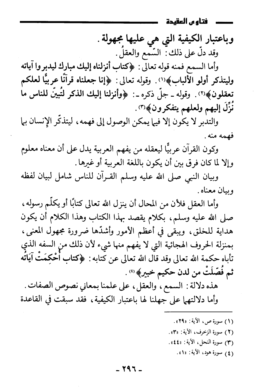 وأما العقل فلأن من المحال أن ينزل الله تعالى كتابا أو يكلّم رسوله، صَلَّى اللَّهُ عَلَيْهِ وَسَلَّمَ، بكلام يقصد بهذا الكتاب وهذا الكلام أن يكون هداية للخلق، ويبقى في أعظم الأمور وأشدّها ضرورة مجهول المعنى، بمنزلة الحروف الهجائية التي لا يفهم منها شيء؛ لأن ذلك من السفة الذي تأباه حكمة الله تعالى وقد قال الله تعالى عن كتابه: {كِتَابٌ أُحْكِمَتْ آيَاتُهُ ثُمَّ فُصِّلَتْ مِنْ لَدُنْ حَكِيمٍ خَبِيرٍ} . .