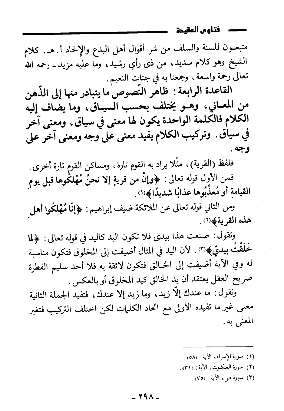 القاعدة الرابعة: ظاهر النصوص ما يتبادر منها إلى الذهن من المعاني، وهو يختلف بحسب السياق، وما يضاف إليه الكلام، فالكلمة الواحدة يكون لها معنى في سياق، ومعنى آخر في سياق. وتركيب الكلام يفيد معنى على وجه ومعنى آخر على وجه.