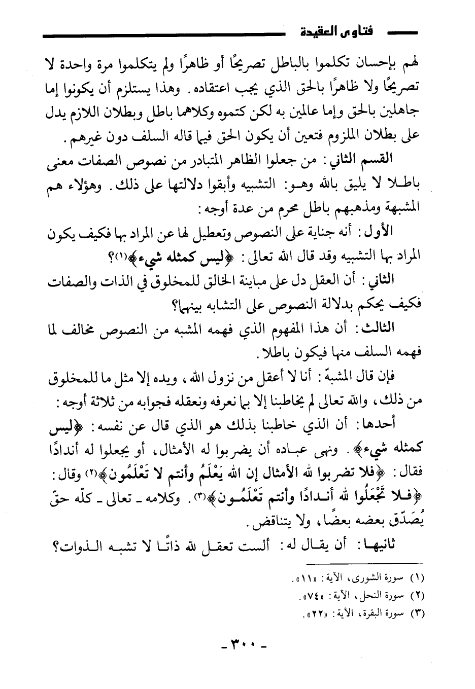القسم الثاني: من جعلوا الظاهر المتبادر من نصوص الصفات معنى باطلا لا يليق بالله وهو: التشبيه وأبقوا دلالتها على ذلك. وهؤلاء هم المشبهة ومذهبهم باطل محرم من عدة أوجه: