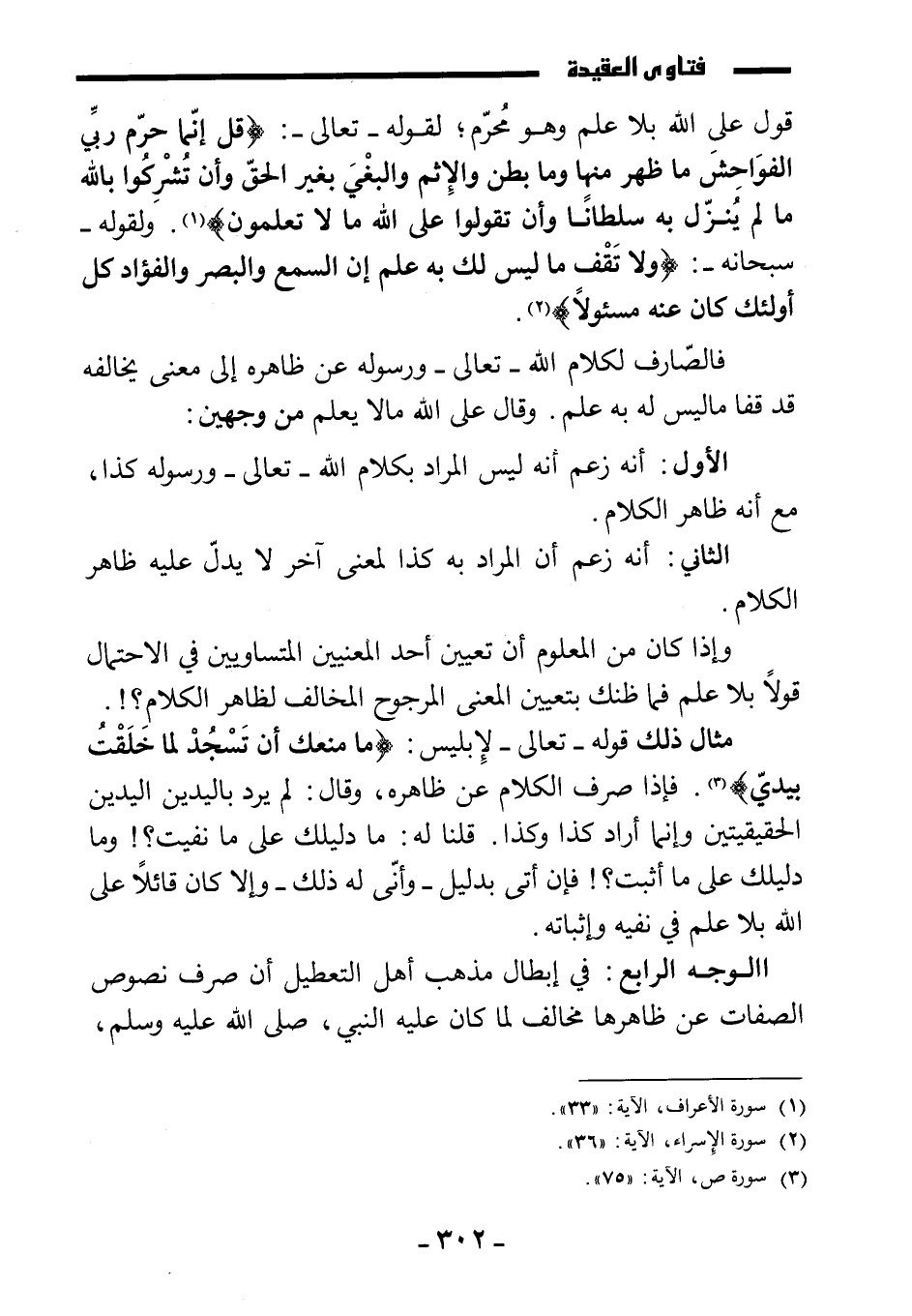 مثال ذلك قوله تعالى لإبليس: {مَا مَنَعَكَ أَنْ تَسْجُدَ لِمَا خَلَقْتُ بِيَدَيَّ} . فإذا صرف الكلام عن ظاهره، وقال: لم يرد باليدين اليدين الحقيقيتين وإنما أراد كذا وكذا. قلنا له: ما دليلك على ما نفيت؟! وما دليلك على ما أثبت؟! فإن أتى بدليل -وأنى له ذلك- وإلا كان قائلا على الله بلا علم في نفيه وإثباته.