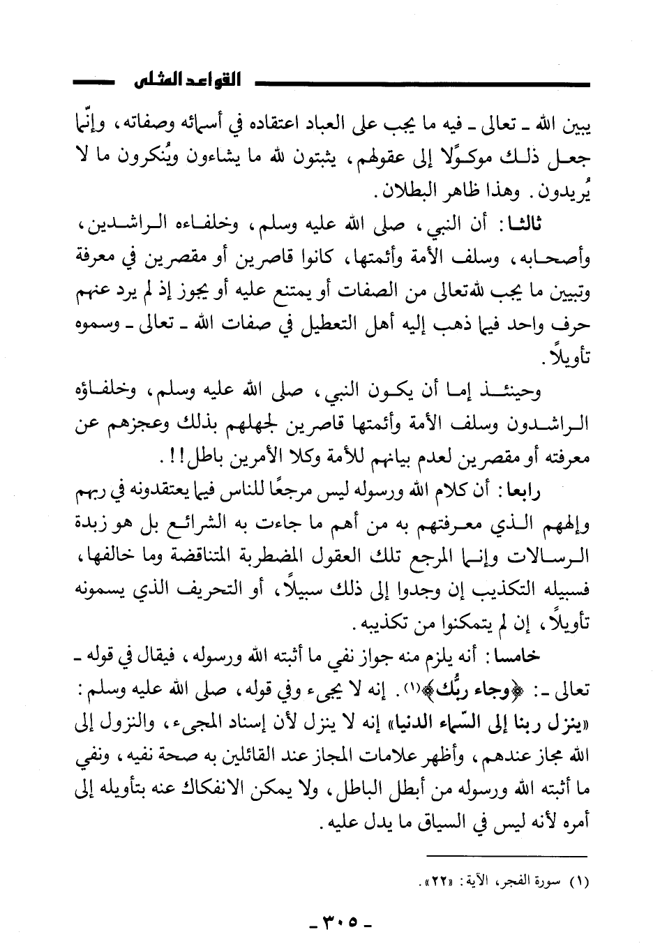 ثالثا: أن النبي، صَلَّى اللَّهُ عَلَيْهِ وَسَلَّمَ، وخلفاءه الراشدين، وأصحابه، وسلف الأمة وأئمتها، كانوا قاصرين أو مقصرين في معرفة وتبيين ما يجب لله تعالى من الصفات أو يمتنع عليه أو يجوز إذ لم يرد عنهم حرف واحد فيما ذهب إليه أهل التعطيل في صفات الله تعالى وسموه تأويلا.