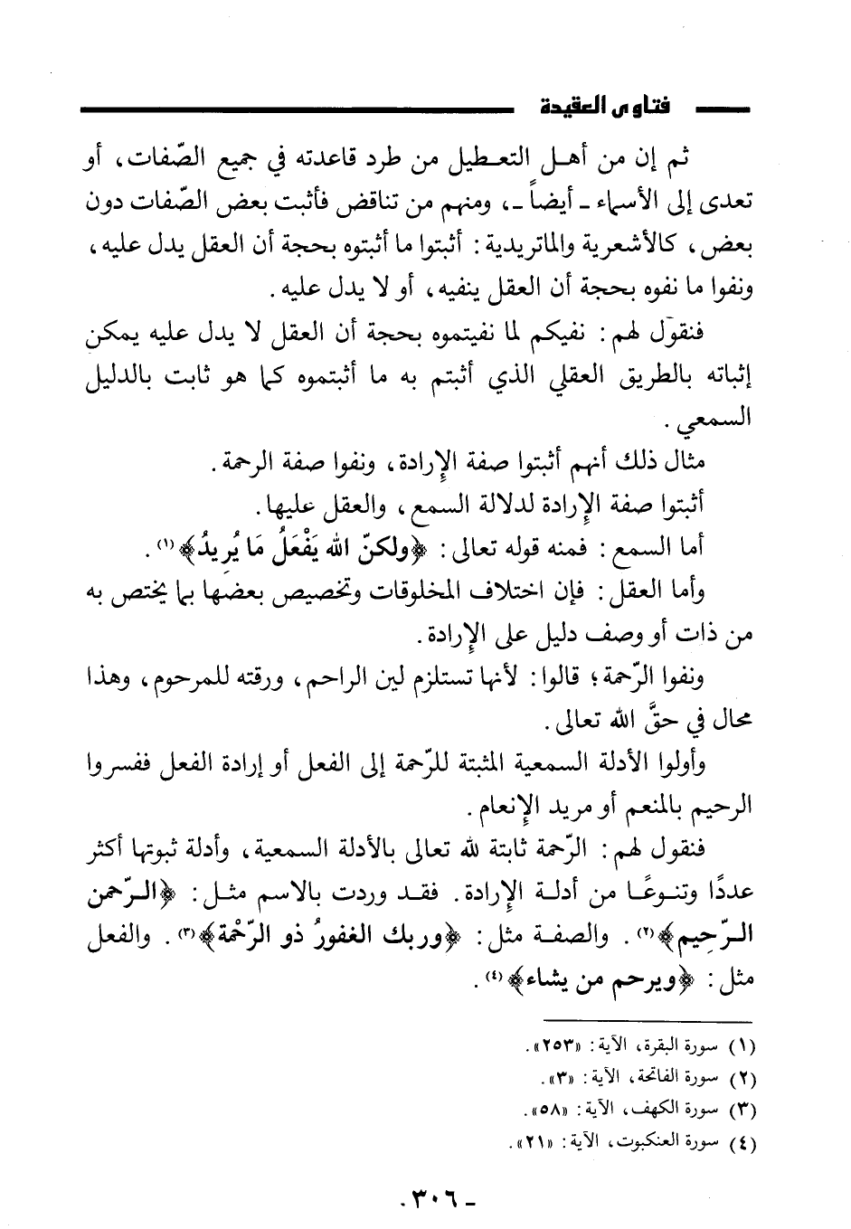 فنقول لهم: الرحمة ثابتة لله تعالى بالأدلة السمعية، وأدلة ثبوتها أكثر عددا وتنوعا من أدلة الإرادة. فقد وردت بالاسم مثل: {الرَّحْمَنِ الرَّحِيمِ} . والصفة مثل: {وَرَبُّكَ الْغَفُورُ ذُو الرَّحْمَةِ} . والفعل مثل: {وَيَرْحَمُ مَنْ يَشَاءُ} .