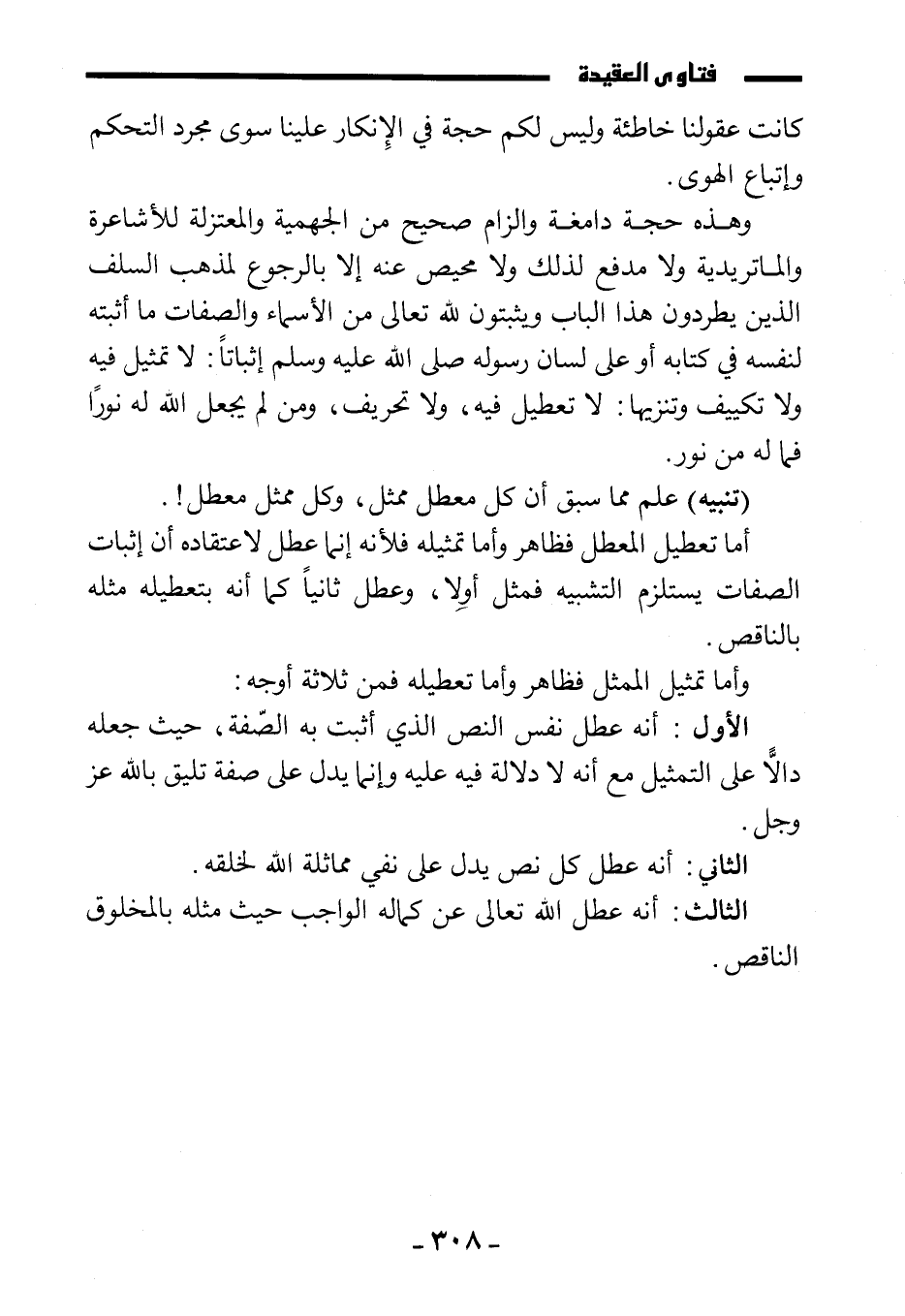 الأول: أنه عطل نفس النص الذي أثبت به الصفة، حيث جعله دالا على التمثيل مع أنه لا دلالة فيه عليه وإنما يدل على صفة تليق بالله عز وجل.