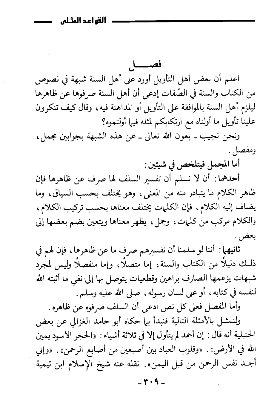 ولنمثل بالأمثلة التالية، فنبدأ بما حكاه أبو حامد الغزالي عن بعض الحنبلية أنه قال: إن أحمد لم يتأول إلا في ثلاثة أشياء: «الحجر الأسود يمين الله في الأرض» . «وقلوب العباد بين أصبعين من أصابع الرحمن» . «وإني أجد نفس الرحمن من قبل اليمن» . نقله عنه شيخ الإسلام ابن تيمية