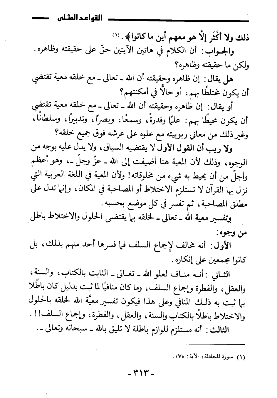 الثاني: أنه مناف لعلو الله تعالى الثابت بالكتاب، والسنة، والعقل، والفطرة وإجماع السلف، وما كان منافيا لما ثبت بدليل كان باطلا بما ثبت به ذلك المنافي، وعلى هذا فيكون تفسير معية الله لخلقه بالحلول والاختلاط باطلا بالكتاب والسنة، والعقل، والفطرة، وإجماع السلف.
