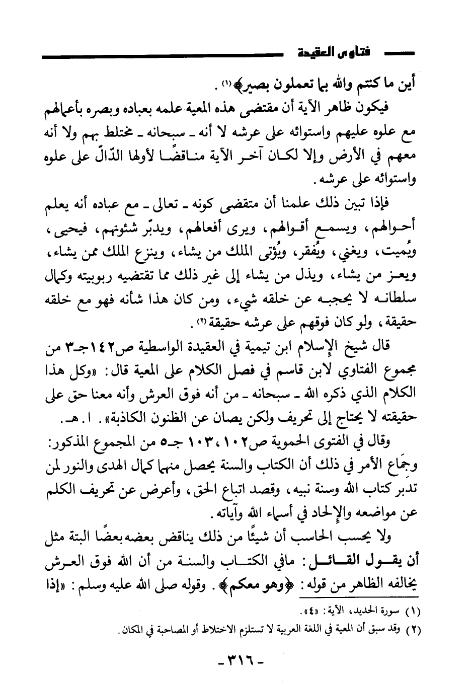 قال شيخ الإسلام ابن تيمية في العقيدة الواسطية ص142جـ3 من مجموع الفتاوى لابن قاسم في فصل الكلام على المعية قال: "وكل هذا الكلام الذي ذكره الله سبحانه من أنه فوق العرش وأنه معنا حق على حقيقته لا يحتاج إلى تحريف ولكن يصان عن الظنون الكاذبة". ا. هـ.