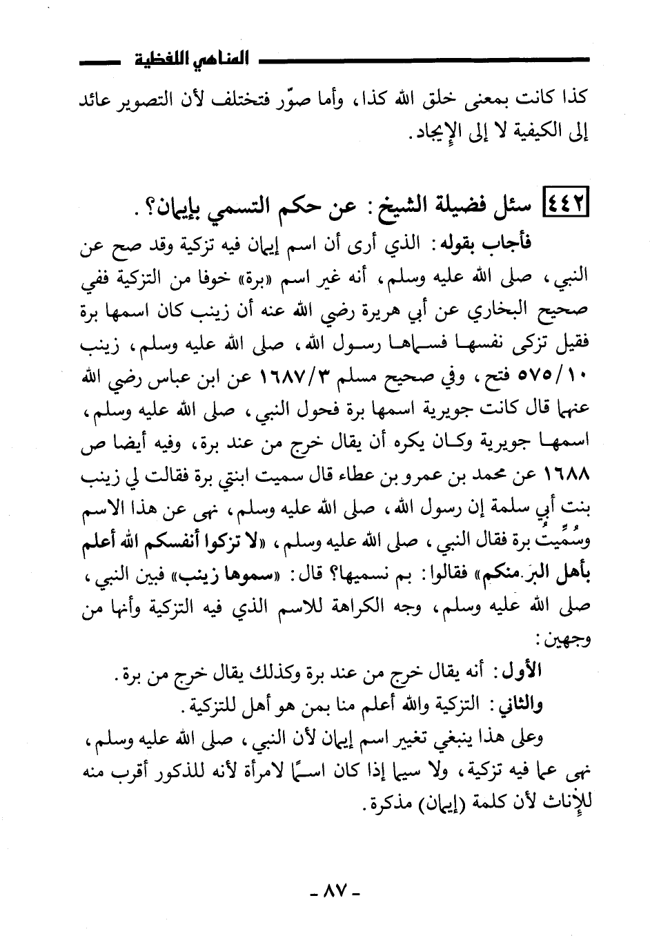 فأجاب بقوله: الذي أرى أن اسم إيمان فيه تزكية، وقد صح عن النبي -صَلَّى اللَّهُ عَلَيْهِ وَسَلَّمَ- أنه غير اسم " برة " خوفا من التزكية ففي صحيح البخاري عن أبي هريرة رضي الله عنه «أن زينب كان اسمها برة، فقيل: تزكي نفسها فسماها رسول الله -صَلَّى اللَّهُ عَلَيْهِ وَسَلَّمَ- زينب» 10 \575 فتح، وفي صحيح مسلم 3 \1687 عن ابن عباس رضي الله عنهما قال: «كانت جويرية اسمها برة، فحول النبي صَلَّى اللَّهُ عَلَيْهِ وَسَلَّمَ اسمها جويرية وكان يكره أن يقال: خرج من عند برة،» وفيه أيضا ص1688 «عن محمد بن عمرو بن عطاء قال: سميت ابنتي برة، فقالت لي زينب بنت أبي سلمة: إن رسول الله -صَلَّى اللَّهُ عَلَيْهِ وَسَلَّمَ- نهى عن هذا الاسم وسميت برة، فقال النبي صَلَّى اللَّهُ عَلَيْهِ وَسَلَّمَ: " لا تزكوا أنفسكم الله أعلم بأهل البر منكم" فقالوا: بم نسميها؟ قال: "سموها زينب» فبين النبي -صَلَّى اللَّهُ عَلَيْهِ وَسَلَّمَ- وجه الكراهة للاسم الذي فيه التزكية، وأنها من وجهين: