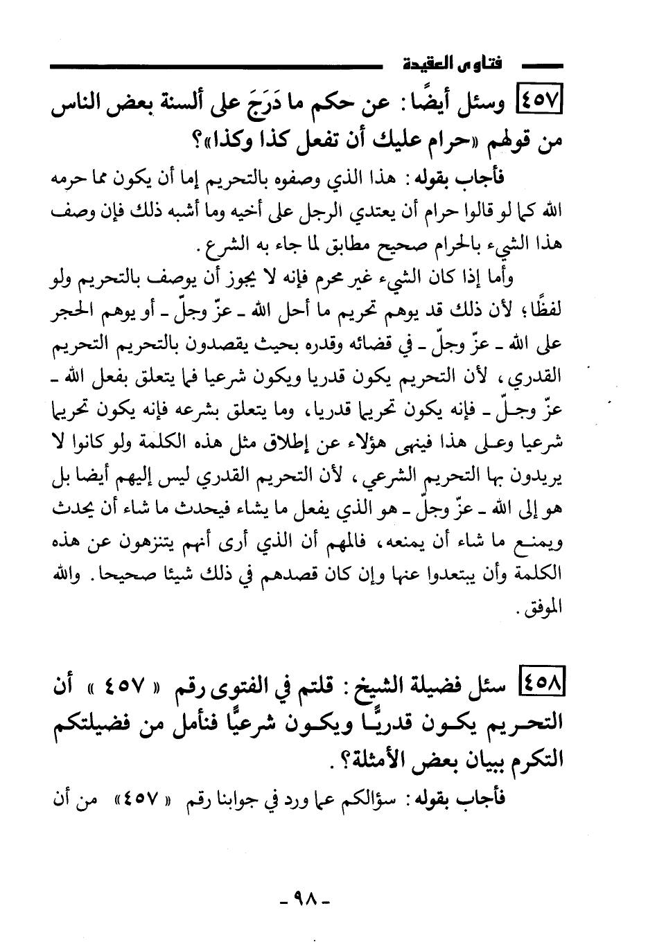 (457) وسئل أيضًا: عن حكم ما درج على ألسنة بعض الناس من قولهم: " حرام عليك أن تفعل كذا وكذا "؟