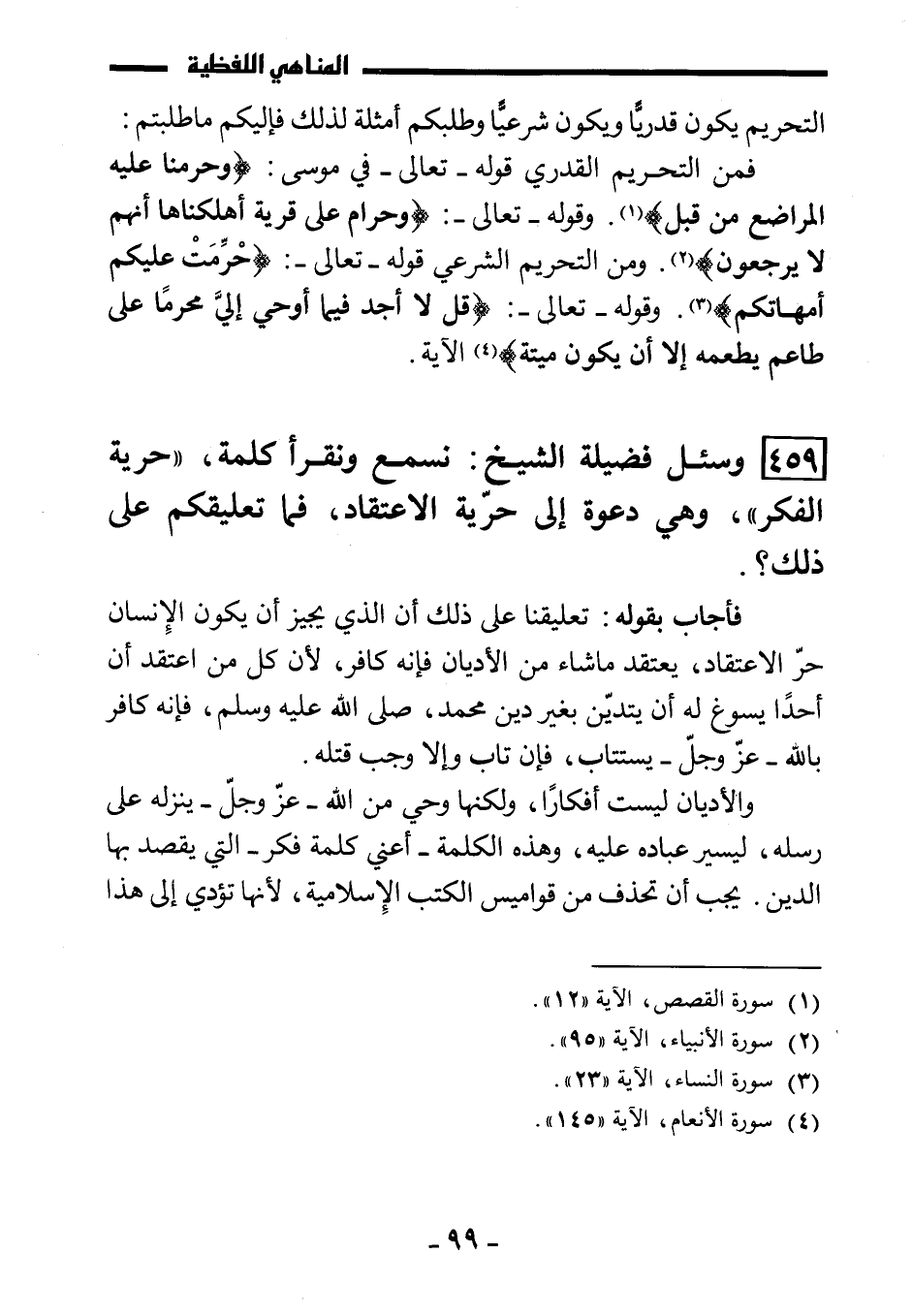 (459) وسئل فضيلة الشيخ: نسمع ونقرأ كلمة، " حرية الفكر "، وهي دعوة إلى حرية الاعتقاد، فما تعليقكم على ذلك؟ .