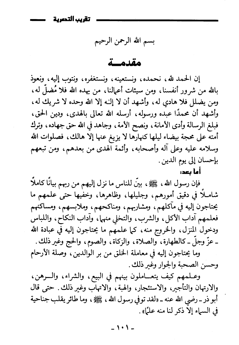 إن الحمد لله، نحمده، ونستعينه، ونستغفره، ونتوب إليه، ونعوذ بالله من شرور أنفسنا، ومن سيئات أعمالنا، من يهده الله فلا مضل له، ومن يضلل فلا هادي له، وأشهد أن لا إله إلا الله وحده لا شريك له، وأشهد أن محمدا عبده ورسوله، أرسله الله تعالى بالهدى، ودين الحق، فبلغ الرسالة وأدى الأمانة، ونصح الأمة، وجاهد في الله حق جهاده، وترك أمته على محجة بيضاء ليلها كنهارها لا يزيغ عنها إلا هالك، فصلوات الله وسلامه عليه وعلى آله وأصحابه، وأئمة الهدى من بعدهم، ومن تبعهم بإحسان إلى يوم الدين.