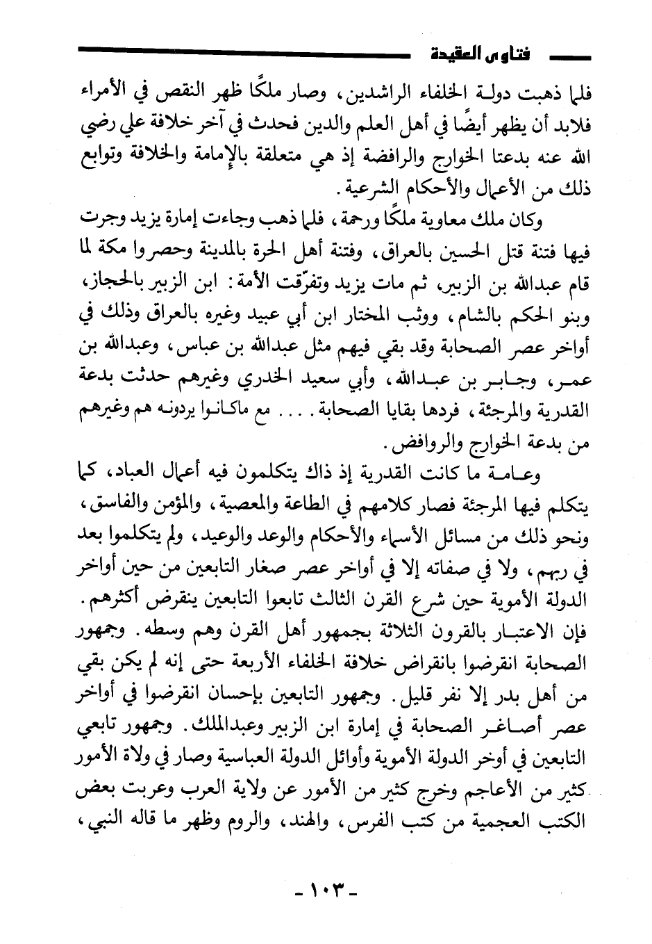 وعامة ما كانت القدرية إذ ذاك يتكلمون فيه أعمال العباد، كما يتكلم فيها المرجئة فصار كلامهم في الطاعة والمعصية، والمؤمن والفاسق، ونحو ذلك من مسائل الأسماء والأحكام والوعد والوعيد، ولم يتكلموا بعد في ربهم، ولا في صفاته إلا في أواخر عصر صغار التابعين من حين أواخر الدولة الأموية حين شرع القرن الثالث تابعو التابعين ينقرض أكثرهم. فإن الاعتبار بالقرون الثلاثة بجمهور أهل القرن وهم وسطه. وجمهور الصحابة انقرضوا بانقراض خلافة الخلفاء الأربعة حتى إنه لم يكن بقي من أهل بدر إلا نفر قليل. وجمهور التابعين بإحسان انقرضوا في أواخر عصر أصاغر الصحابة في إمارة ابن الزبير وعبد الملك. وجمهور تابعي التابعين في أواخر الدولة الأموية وأوائل الدولة العباسية وصار في ولاة الأمور كثير من الأعاجم وخرج كثير من الأمور عن ولاية العرب وعُرِّبت بعض الكتب العجمية من كتب الفرس، والهند، والروم وظهر ما قاله النبي
