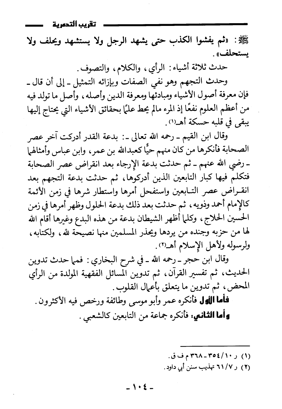 وقال ابن حجر -رحمه الله- في شرح البخاري: فمما حدث تدوين الحديث، ثم تفسير القرآن، ثم تدوين المسائل الفقهية المولدة من الرأي المحض، ثم تدوين ما يتعلق بأعمال القلوب.