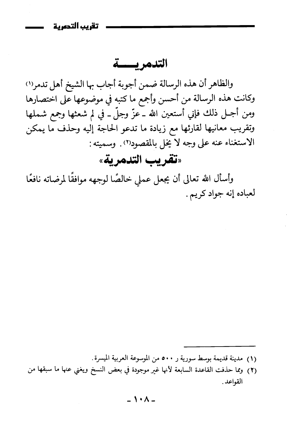 والظاهر أن هذه الرسالة ضمن أجوبة أجاب بها الشيخ أهل تدمر (¬1) وكانت هذه الرسالة من أحسن وأجمع ما كتبه في موضوعها على اختصارها ومن أجل ذلك فإني أستعين الله عز وجل في لم شعثها وجمع شملها وتقريب معانيها لقارئها مع زيادة ما تدعو الحاجة إليه وحذف ما يمكن الاستغناء عنه على وجه لا يخل بالمقصود (¬2) . وسميته: