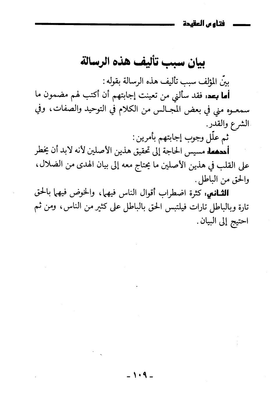 أما بعد: فقد سألني من تعينت إجابتهم أن أكتب لهم مضمون ما سمعوه مني في بعض المجالس من الكلام في التوحيد والصفات، وفي الشرع والقدر.
