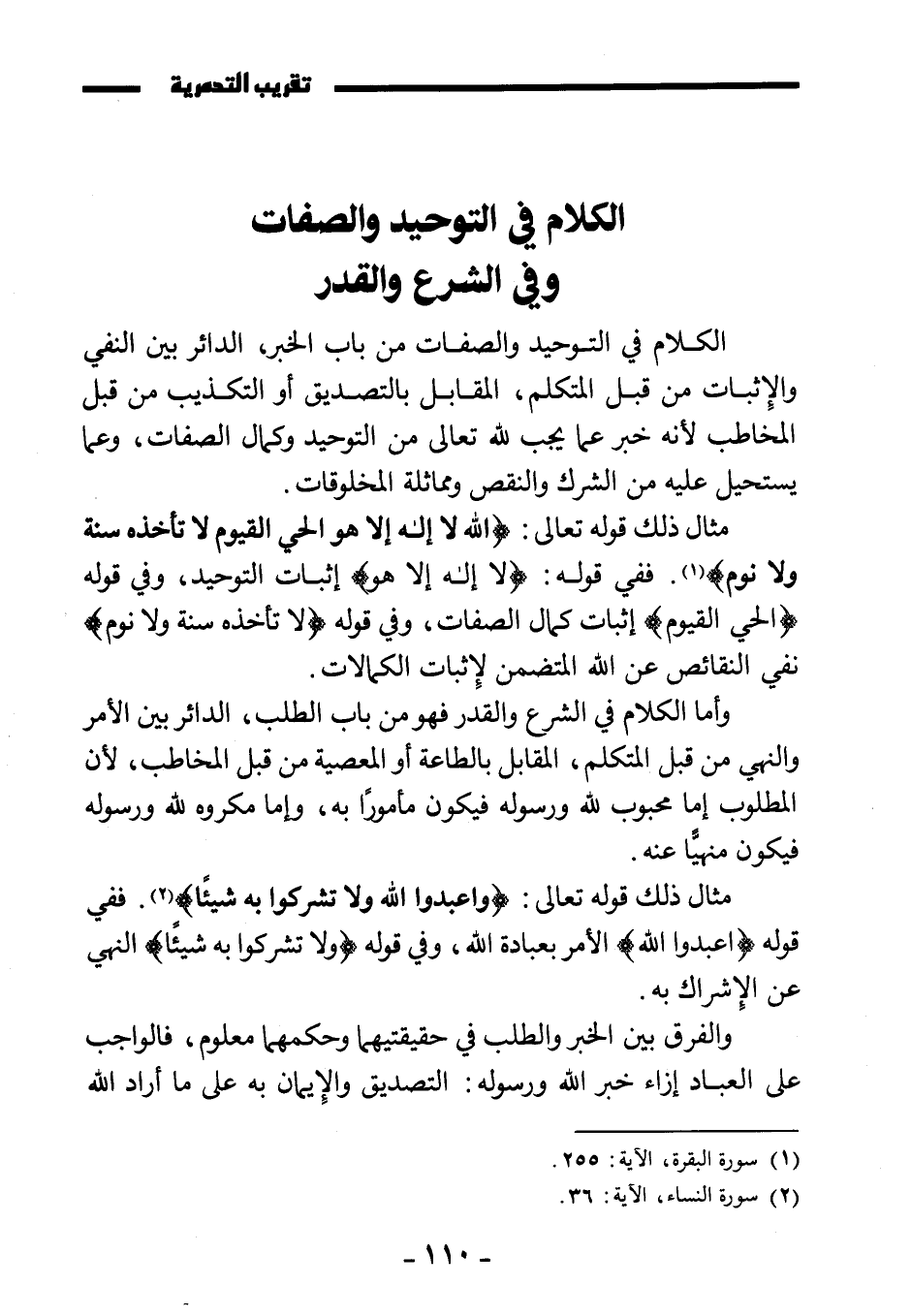الكلام في التوحيد والصفات من باب الخبر، الدائر بين النفي والإثبات من قبل المتكلم، المقابل بالتصديق أو التكذيب من قبل المخاطب لأنه خبر عما يجب لله تعالى من التوحيد وكمال الصفات، وعما يستحيل عليه من الشرك والنقص ومماثلة المخلوقات.