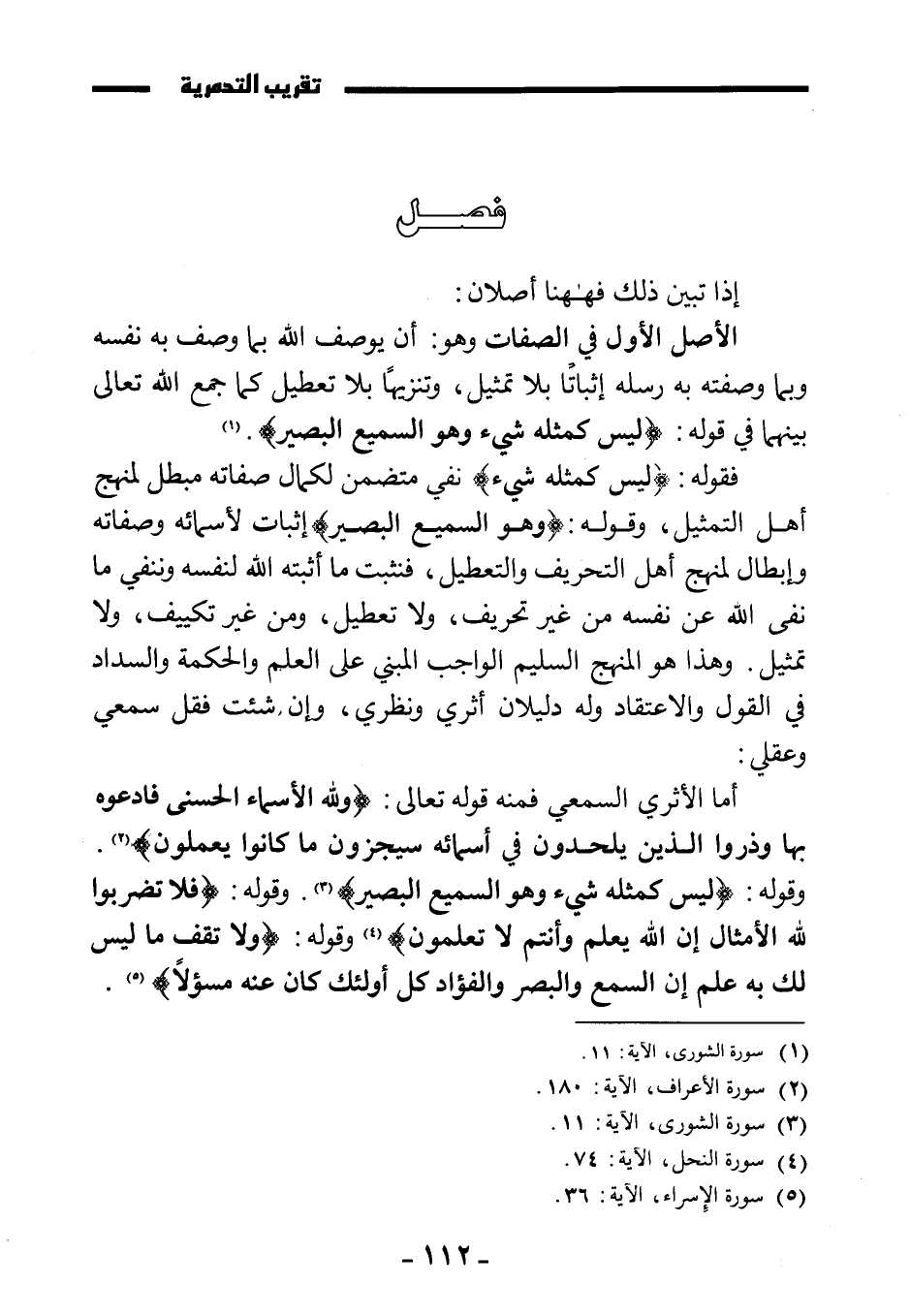 الأصل الأول في الصفات وهو: أن يوصف الله بما وصف به نفسه وبما وصفته به رسله إثباتا بلا تمثيل، وتنزيها بلا تعطيل كما جمع الله تعالى بينهما في قوله: {لَيْسَ كَمِثْلِهِ شَيْءٌ وَهُوَ السَّمِيعُ الْبَصِيرُ} .