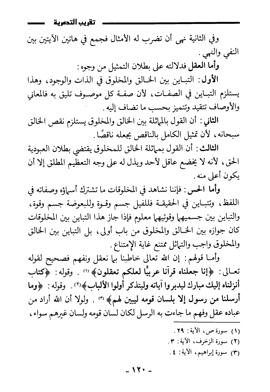 وأما قولهم: إن الله تعالى خاطبنا بما نعقل ونفهم فصحيح لقوله تعالى: {إِنَّا جَعَلْنَاهُ قُرْآنًا عَرَبِيًّا لَعَلَّكُمْ تَعْقِلُونَ} . وقوله: {كِتَابٌ أَنْزَلْنَاهُ إِلَيْكَ مُبَارَكٌ لِيَدَّبَّرُوا آيَاتِهِ وَلِيَتَذَكَّرَ أُولُو الْأَلْبَابِ} . وقوله: {وَمَا أَرْسَلْنَا مِنْ رَسُولٍ إِلَّا بِلِسَانِ قَوْمِهِ لِيُبَيِّنَ لَهُمْ} . ولولا أن الله أراد من عباده عقل وفهم ما جاءت به الرسل لكان لسان قومه ولسان غيرهم سواء،