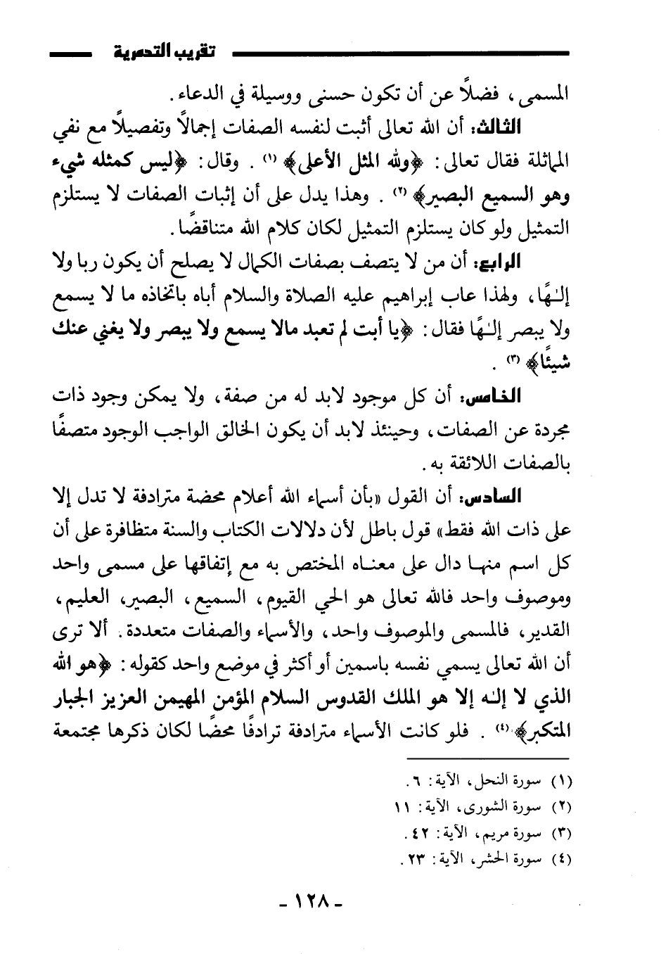 السادس: أن القول" بأن أسماء الله أعلام محضة مترادفة لا تدل إلا على ذات الله فقط" قول باطل لأن دلالات الكتاب والسنة متضافرة على أن كل اسم منها دال على معناه المختص به مع اتفاقها على مسمى واحد وموصوف واحد فالله تعالى هو الحي القيوم، السميع، البصير، العليم، القدير، فالمسمى والموصوف واحد، والأسماء والصفات متعددة. ألا ترى أن الله تعالى يسمي نفسه باسمين أو أكثر في موضع واحد كقوله: {هُوَ اللَّهُ الَّذِي لَا إِلَهَ إِلَّا هُوَ الْمَلِكُ الْقُدُّوسُ السَّلَامُ الْمُؤْمِنُ الْمُهَيْمِنُ الْعَزِيزُ الْجَبَّارُ الْمُتَكَبِّرُ} . فلو كانت الأسماء مترادفة ترادفا محضا لكان ذكرها مجتمعة