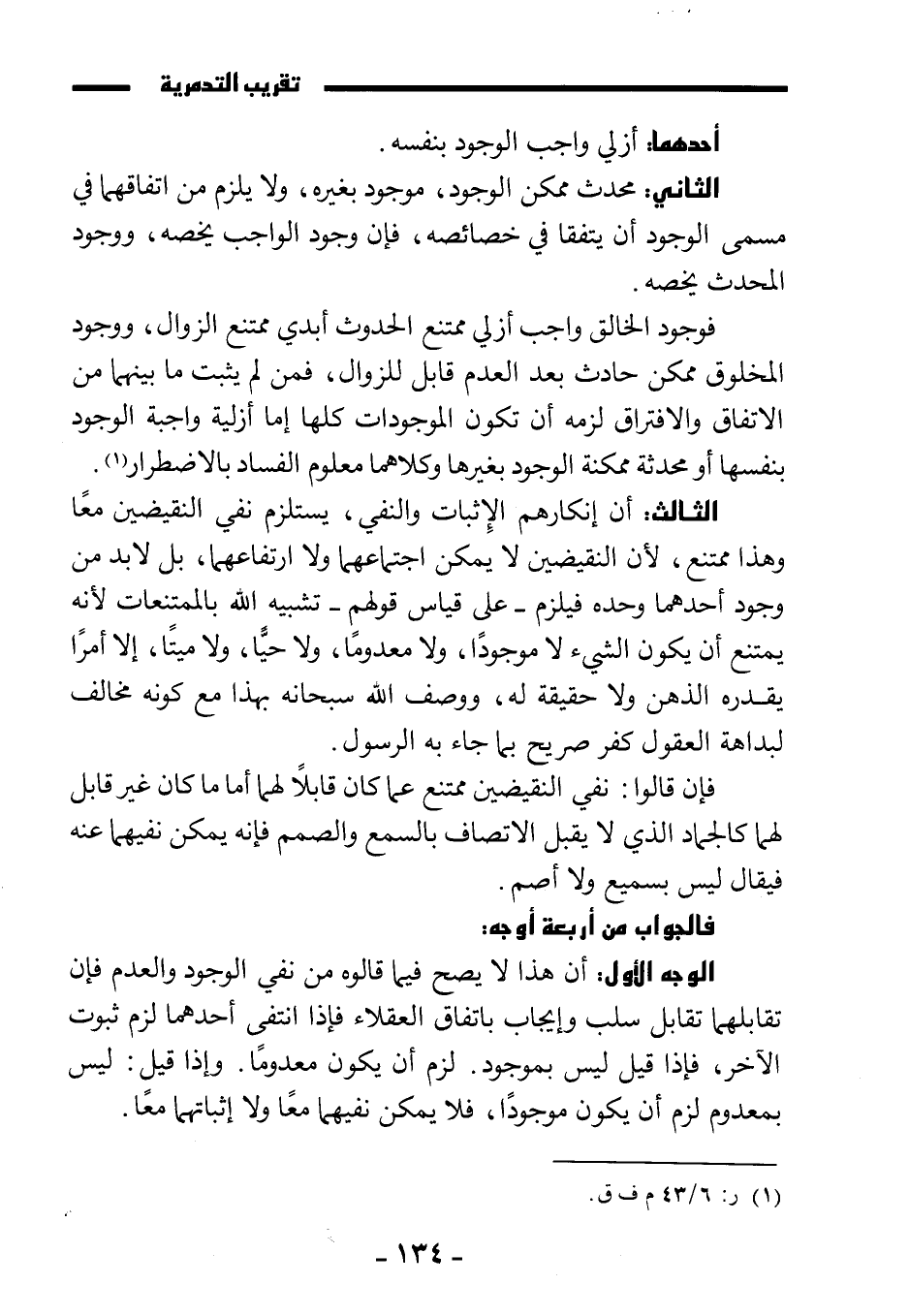 الوجه الأول: أن هذا لا يصح فيما قالوه من نفي الوجود والعدم فإن تقابلهما تقابل سلب وإيجاب باتفاق العقلاء فإذا انتفى أحدهما لزم ثبوت الآخر، فإذا قيل: ليس بموجود. لزم أن يكون معدوما. وإذا قيل: ليس بمعدوم لزم أن يكون موجودا، فلا يمكن نفيهما معا ولا إثباتهما معا.