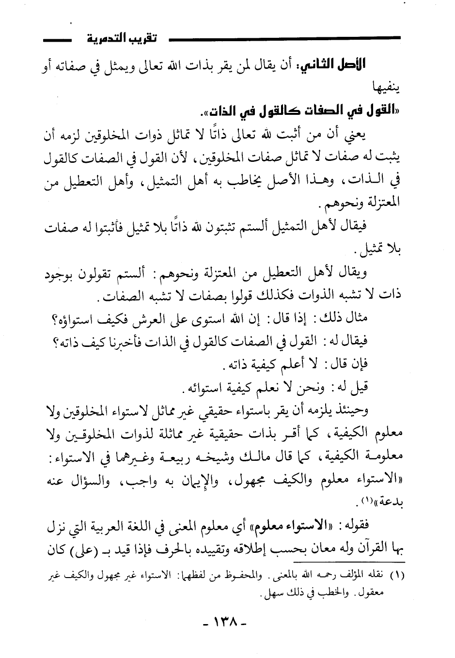 وحينئذ يلزمه أن يقر باستواء حقيقي غير مماثل لاستواء المخلوقين ولا معلوم الكيفية، كما أقر بذات حقيقية غير مماثلة لذوات المخلوقين ولا معلومة الكيفية، كما قال مالك وشيخه ربيعة وغيرهما في الاستواء: " الاستواء معلوم والكيف مجهول، والإيمان به واجب، والسؤال عنه بدعة ". (¬1)