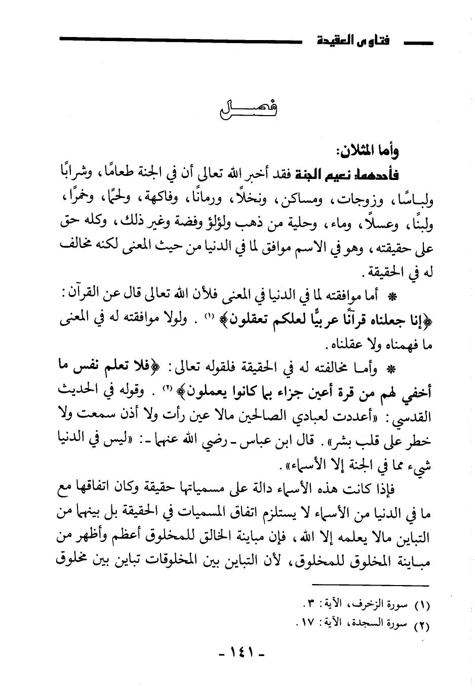 فأحدهما: نعيم الجنة، فقد أخبر الله تعالى أن في الجنة طعاما، وشرابا ولباسا، وزوجات، ومساكن، ونخلا، ورمانا، وفاكهة، ولحما، وخمرا، ولبنا، وعسلا، وماء، وحلية من ذهب ولؤلؤ وفضة وغير ذلك، وكله حق على حقيقته، وهو في الاسم موافق لما في الدنيا من حيث المعنى لكنه مخالف له في الحقيقة.