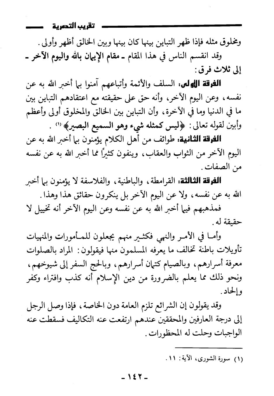 الفرقة الأولى: السلف والأئمة وأتباعهم آمنوا بما أخبر الله به عن نفسه، وعن اليوم الآخر، وأنه حق على حقيقته مع اعتقادهم التباين بين ما في الدنيا وما في الآخرة، وأن التباين بين الخالق والمخلوق أولى وأعظم وأبين لقوله تعالى: {لَيْسَ كَمِثْلِهِ شَيْءٌ وَهُوَ السَّمِيعُ الْبَصِيرُ} .