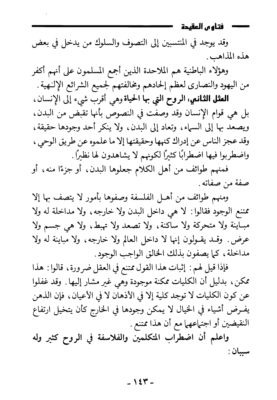 ومنهم طوائف من أهل الفلسفة وصفوها بأمور لا يتصف بها إلا ممتنع الوجود فقالوا: لا هي داخل البدن ولا خارجه، ولا مداخلة له ولا مباينة ولا متحركة ولا ساكنة، ولا تصعد ولا تهبط، ولا هي جسم ولا عرض. وقد يقولون: إنها لا داخل العالم ولا خارجه، ولا مباينة له ولا مداخلة، كما يصفون بذلك الخالق الواجب الوجود.