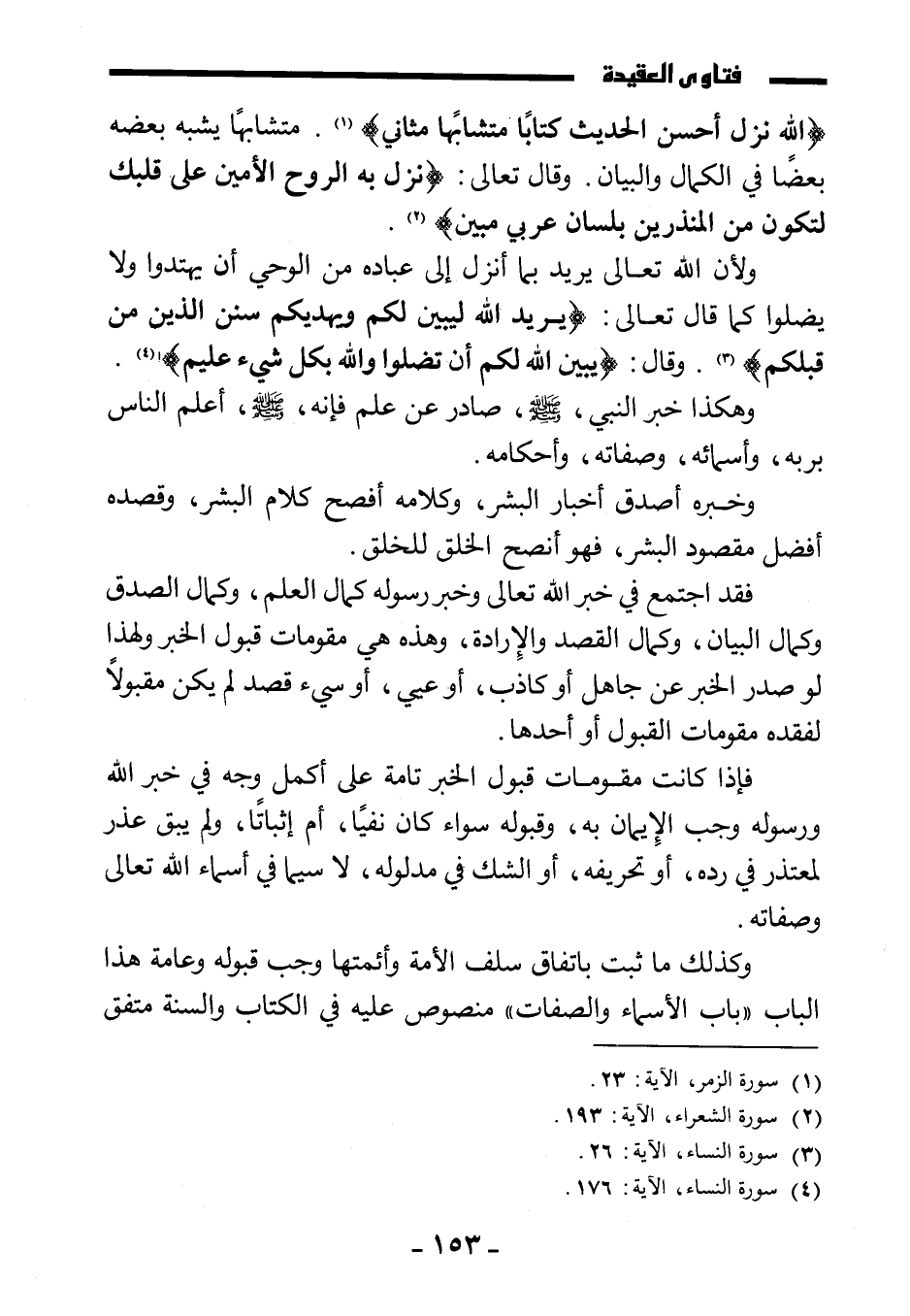 {اللَّهُ نَزَّلَ أَحْسَنَ الْحَدِيثِ كِتَابًا مُتَشَابِهًا مَثَانِيَ} . متشابها يشبه بعضه بعضا في الكمال والبيان. وقال تعالى: {نَزَلَ بِهِ الرُّوحُ الْأَمِينُ عَلَى قَلْبِكَ لِتَكُونَ مِنَ الْمُنْذِرِينَ بِلِسَانٍ عَرَبِيٍّ مُبِينٍ} .