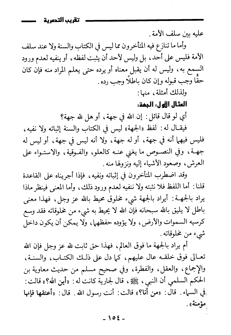 أم يراد بالجهة ما فوق العالم، فهذا حق ثابت لله عز وجل فإن الله تعالى فوق خلقه عال عليهم، كما دل على ذلك الكتاب، والسنة، والإجماع، والعقل، والفطرة، وفي صحيح مسلم من حديث معاوية بن الحكم السلمي «أن النبي صَلَّى اللَّهُ عَلَيْهِ وَسَلَّمَ قال لجارية كانت له: " أين الله؟ " قالت: في السماء. قال: " من أنا؟ " قالت: أنت رسول الله. قال: "أعتقها فإنها مؤمنة» .