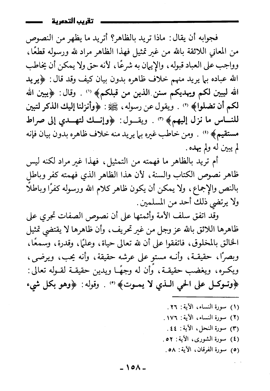 فجوابه أن يقال: ماذا تريد بالظاهر؟ أتريد ما يظهر من النصوص من المعاني اللائقة بالله من غير تمثيل فهذا الظاهر مراد لله ورسوله قطعا، وواجب على العباد قبوله، والإيمان به شرعا، لأنه حق ولا يمكن أن يخاطب الله عباده بما يريد منهم خلاف ظاهره بدون بيان كيف وقد قال: {يُرِيدُ اللَّهُ لِيُبَيِّنَ لَكُمْ وَيَهْدِيَكُمْ سُنَنَ الَّذِينَ مِنْ قَبْلِكُمْ} . وقال: {يُبَيِّنُ اللَّهُ لَكُمْ أَنْ تَضِلُّوا} . ويقول عن رسوله صَلَّى اللَّهُ عَلَيْهِ وَسَلَّمَ: {وَأَنْزَلْنَا إِلَيْكَ الذِّكْرَ لِتُبَيِّنَ لِلنَّاسِ مَا نُزِّلَ إِلَيْهِمْ} . ويقول: {وَإِنَّكَ لَتَهْدِي إِلَى صِرَاطٍ مُسْتَقِيمٍ} . ومن خاطب غيره بما يريد منه خلاف ظاهره بدون بيان فإنه لم يبين له ولم يهده.