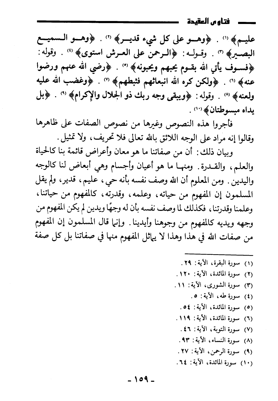 {وَهُوَ عَلَى كُلِّ شَيْءٍ قَدِيرٌ} . {وَهُوَ السَّمِيعُ الْبَصِيرُ} . وقوله: {الرَّحْمَنُ عَلَى الْعَرْشِ اسْتَوَى} . وقوله: {فَسَوْفَ يَأْتِي اللَّهُ بِقَوْمٍ يُحِبُّهُمْ وَيُحِبُّونَهُ} . {رَضِيَ اللَّهُ عَنْهُمْ وَرَضُوا عَنْهُ} ، {وَلَكِنْ كَرِهَ اللَّهُ انْبِعَاثَهُمْ فَثَبَّطَهُمْ} . {وَغَضِبَ اللَّهُ عَلَيْهِ وَلَعَنَهُ} وقوله: {وَيَبْقَى وَجْهُ رَبِّكَ ذُو الْجَلَالِ وَالْإِكْرَامِ} . {بَلْ يَدَاهُ مَبْسُوطَتَانِ} .