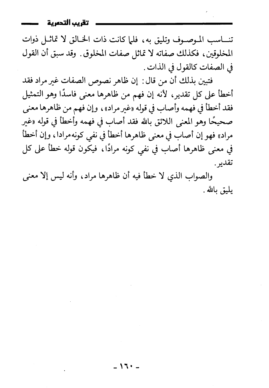 فتبين بذلك أن من قال: إن ظاهر نصوص الصفات غير مراد فقد أخطأ على كل تقدير، لأنه إن فهم من ظاهرها معنى فاسدا وهو التمثيل فقد أخطأ في فهمه وأصاب في قوله: "غير مراد " وإن فهم من ظاهرها معنى صحيحا وهو المعنى اللائق بالله فقد أصاب في فهمه وأخطأ في قوله: "غير مراد" فهو إن أصاب في معنى ظاهرها أخطأ في نفي كونه مرادا، وإن أخطأ في معنى ظاهرها أصاب في نفي كونه مرادا، فيكون قوله خطأ على كل تقدير.